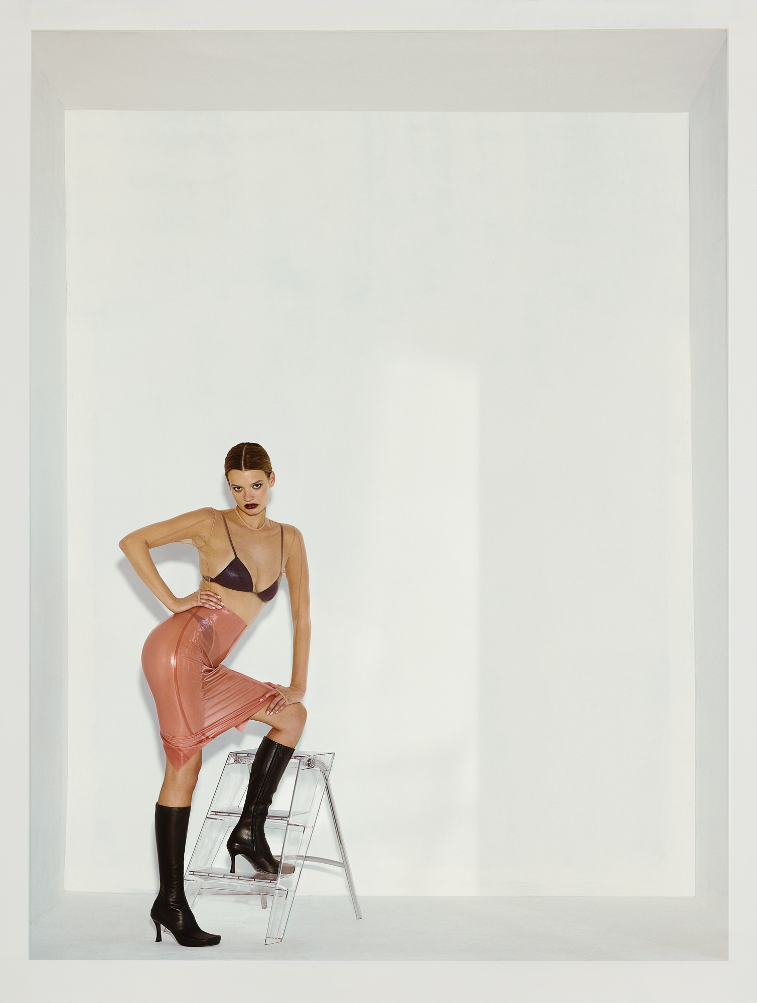Right: Mesh body suit by ALEX PERRY. Lady P pencil skirt and Deep V G-string by ATSUKO KUDO. Vegan Leather Triangle bra by FLEUR DU MAL. Boots by BALENCIAGA x SCHOLL. Eyewear by DISTRICT VISION. Upper Stepstool by Alberto Meda for KARTELL