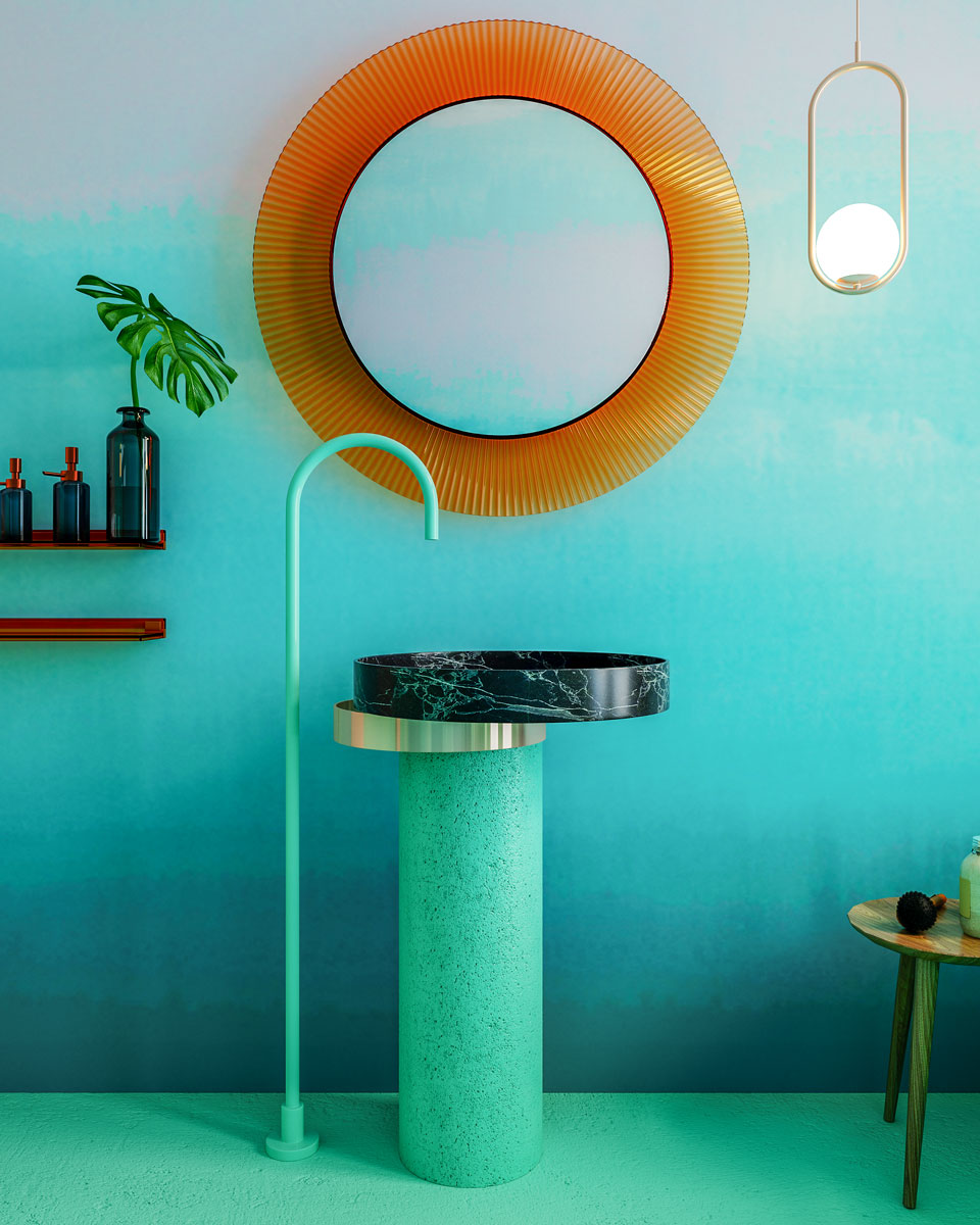 Everything was custom-built except for the sofa, chairs, and lamps. We even customized the bathroom. I’m always trying to offer extraordinary solutions. We used polyurethane, cement, concrete, copper, and plastic in this interior. Plastic works very well for me. I love using concrete, but not gray. I like playing with colors. And cement. You can make truly amazing things. I used terrazzo here as well. Terrazzo has become fashionable lately, but in fact it’s a material that’s long been known for combining, for example, cement and marble chips.