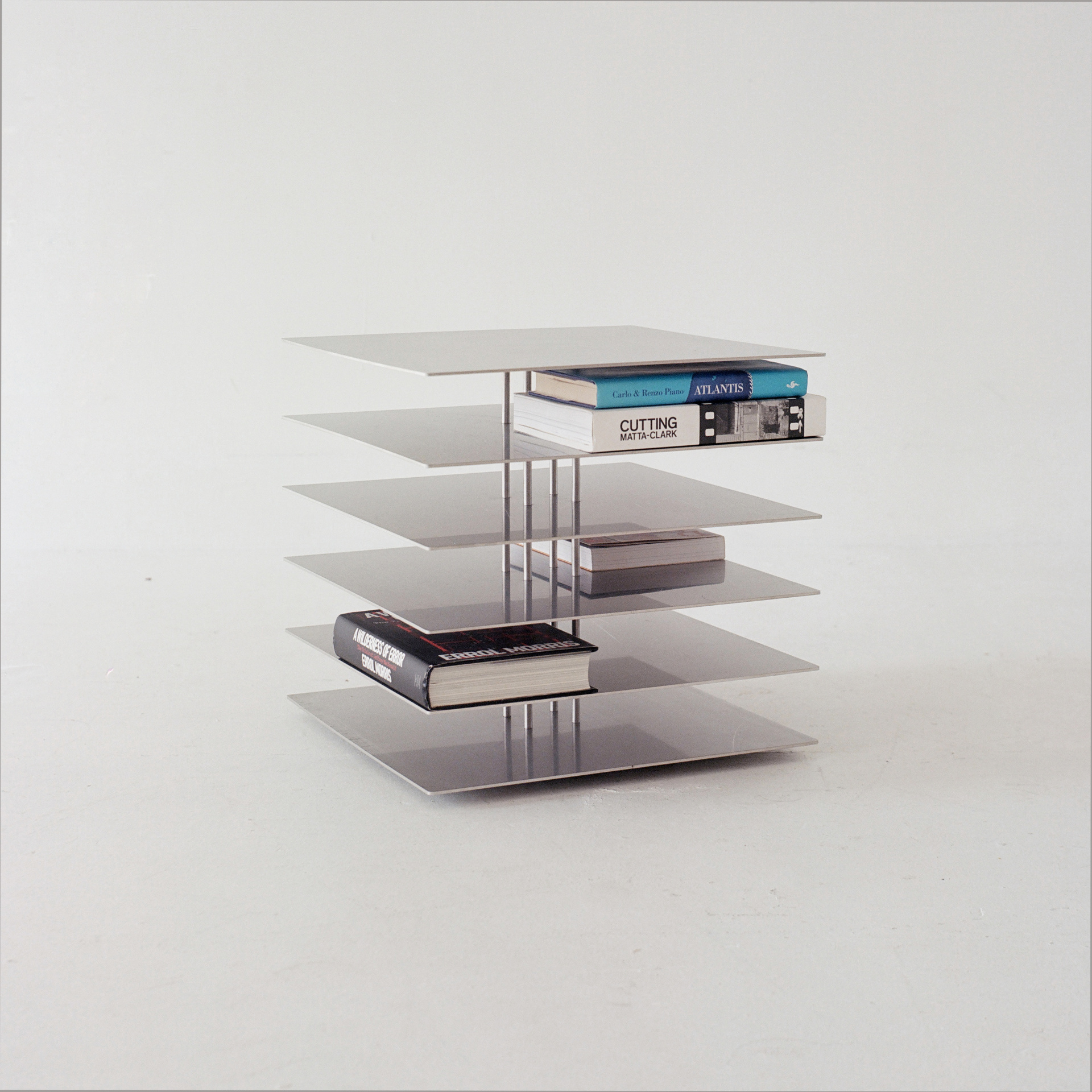 Ford took that idea and rebuilt it as a stainless steel side table. Flat metal plates stack at different heights connected by thin vertical posts. Depending on the angle, a trick of the eye makes those posts seem to vanish. Suddenly you’re staring at shelves floating in space with no visible means of support.