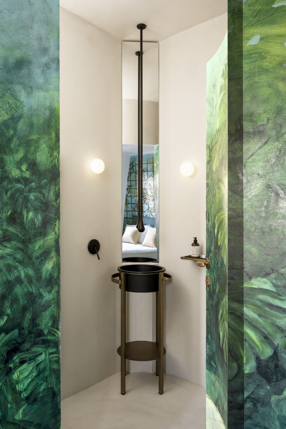Dora’s expertise in scenography plays a major role in the guest bedroom, where the artist Yann Lacroix has covered the entire room with a custom mural of cockatiels perching on trellises and peach trees. The predominantly green and blue mural brings in a calming effect, and its vibrant palette pulls from French Rococo while the lines are rendered in a style that matches the Neoclassical Arc de Triomphe.