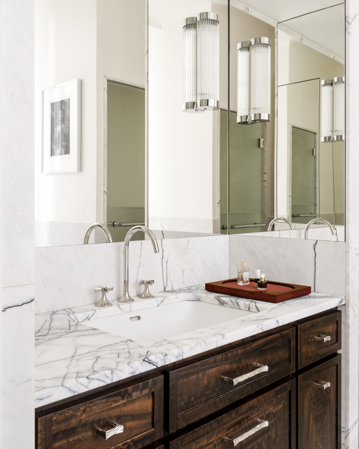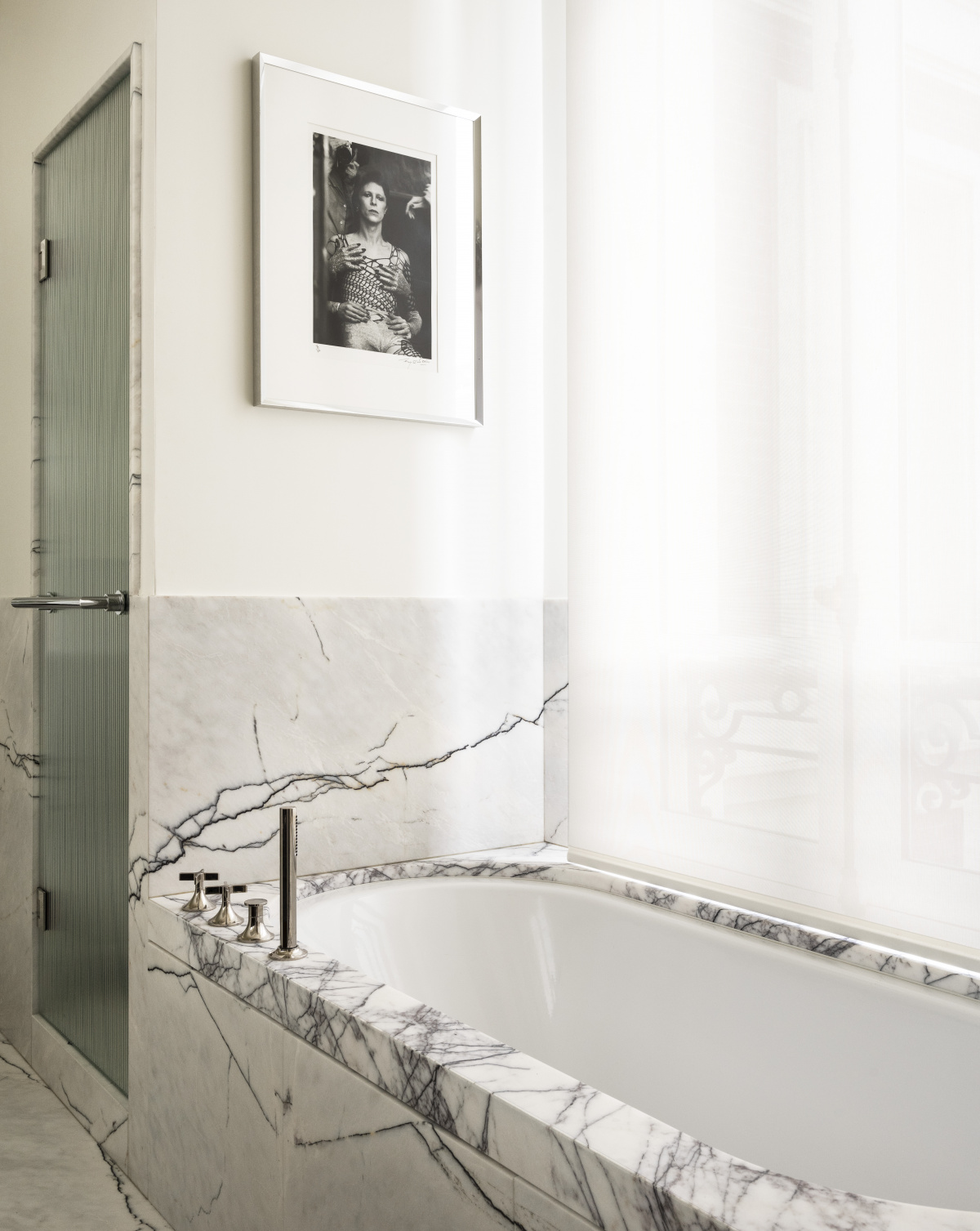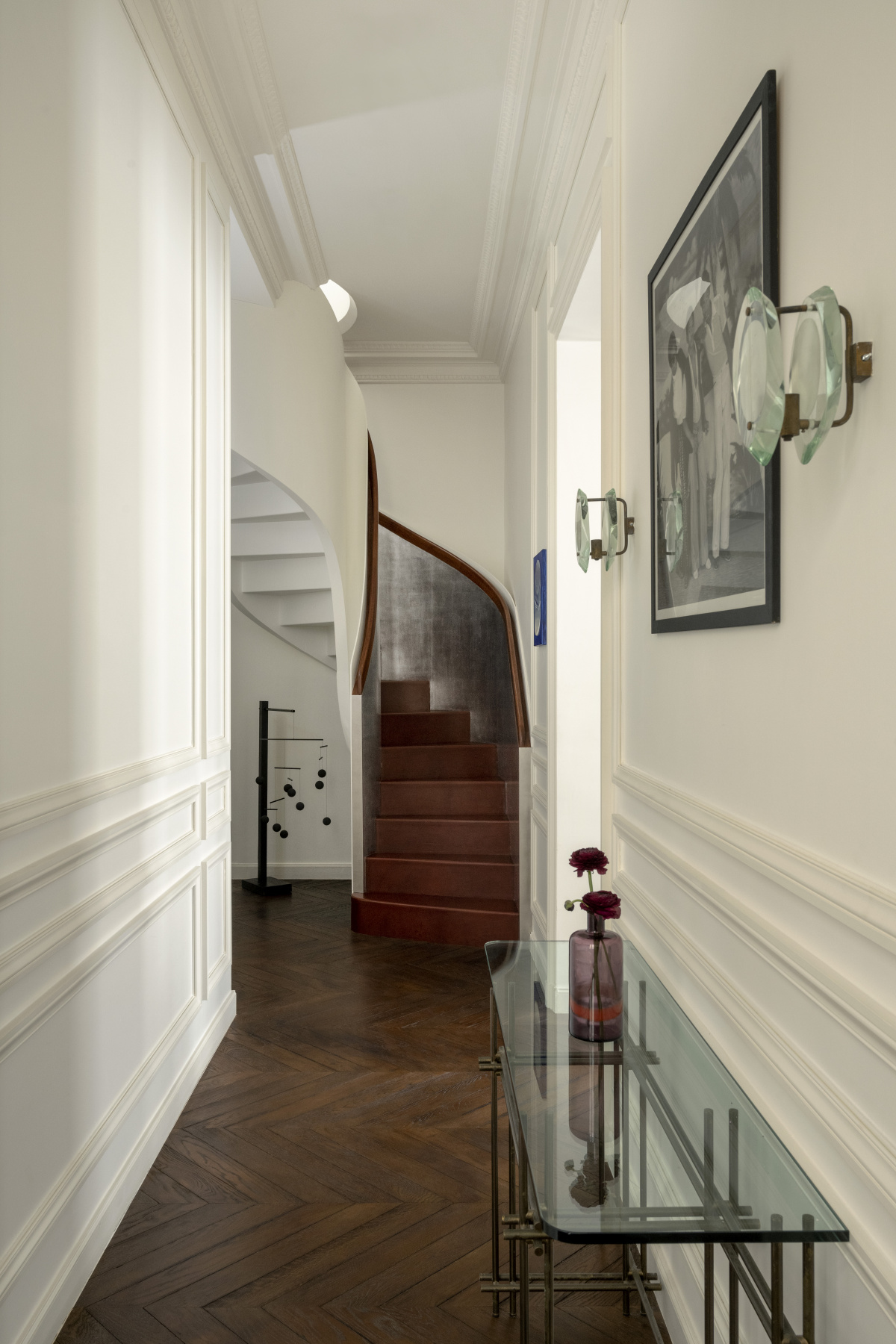 The gilded touch of the baseboards is complemented by Mériguet-Carrère Workshops’ custom painted metallic effect, which is applied to some of the cabinetry. In this sun-filled apartment light bounces off the shimmering surface, warming up the marble counters. Metallic finishes also shine in a historic, curved staircase, which Dora restored with a palladium leaf covering. The reflective surface leads to a dramatic entrance every time you enter the common areas.