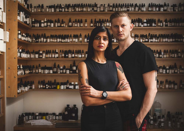 We recently caught up with Kavi, who handles packaging design and branding, and David, who sources the scents, to chat about bringing an edge to the perfume world, the hard work of launching a flagship, and how their other creative backgrounds (architecture for Kavi, music for David) translate to the fragrance world.