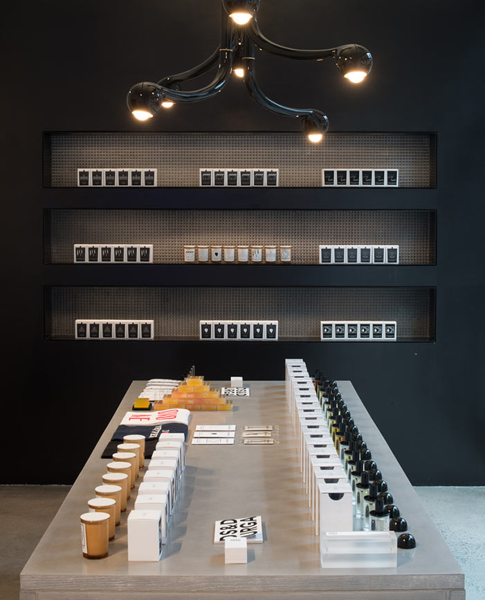 KM: Yeah, we worked with a lot of Brooklyn craftspeople. The concrete is board-formed, so it’s a functional piece, the island that you see in the center, which stores all the perfume inside. And the panels are board-formed concrete, except for the smooth top—all custom-made. It’s beautiful. The desk is also made from board-formed concrete and suspends from a steel bar, so it’s floating off the floor. There’s a lot of intention and thought to details.