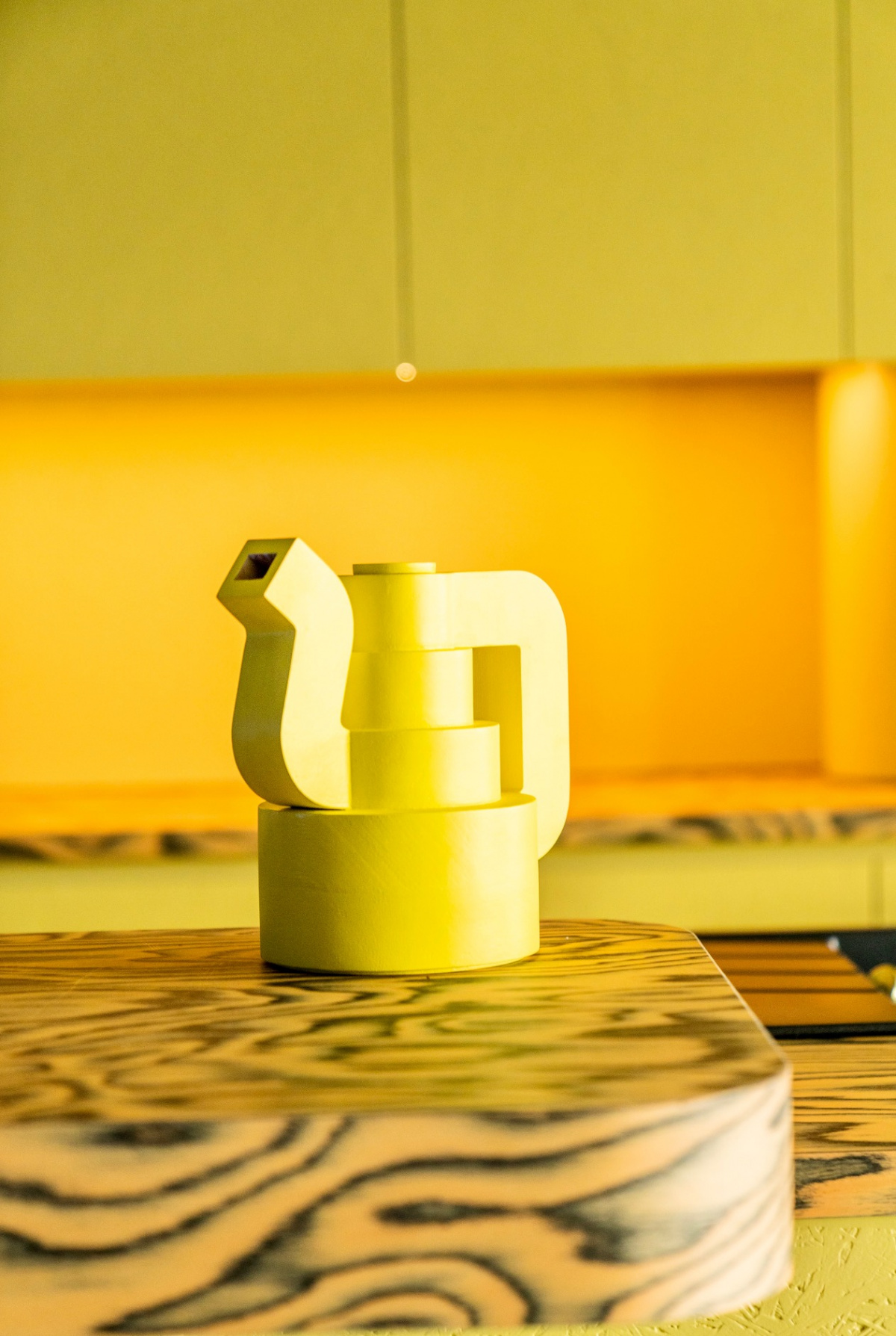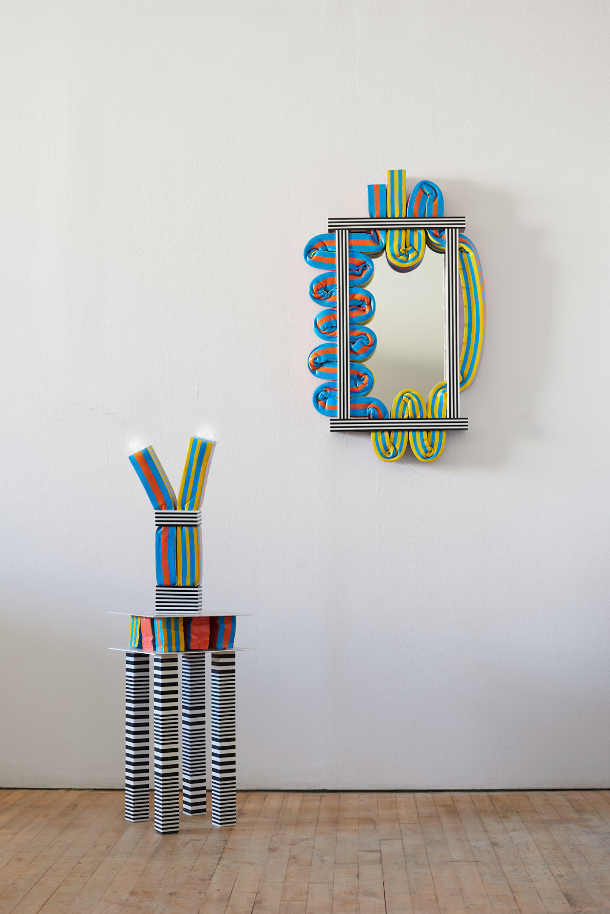 Kiki Goti is a Greek architect and designer based in Brooklyn, NY. At the Design Week Factory, she showed a collection of striped creations made from acrylic sheets and brightly painted air conditioning foam, which she began experimenting with during the 2020 lockdown. The resulting mirrors, lamps, and tables beg to be touched and squeezed like a stress ball, recreating symbols of domesticity for a more energetic and stimulating environment.