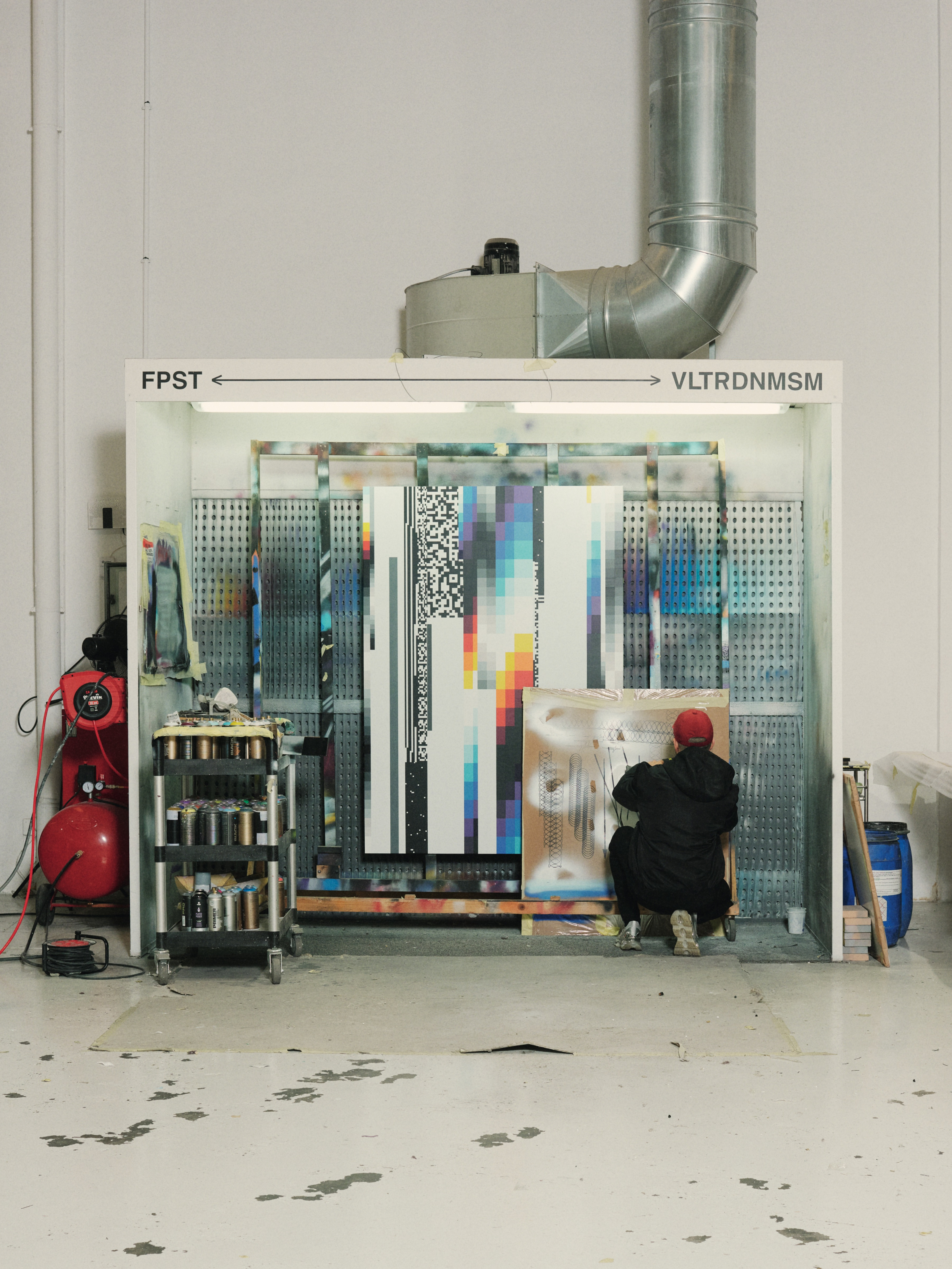 Like one of his artworks, there is a lot to take in at the studio of Felipe Pantone, situated in an industrial zone near Valencia. In one section, a team of masked painters is rendering surfaces with the dynamically colored grids, stripes, bolts, and checkerboards that typify his work. In another, an assistant is finishing off 220 Perspex discs printed with a whirligig pattern that will go on to assemble a kinetic sculpture. Ink jet printers, CNC mills, and assorted machinery whir in the background. In a separate space next door, a carpenter constructs wooden crates to ship Pantone’s works to prestigious galleries and art collectors the world over.