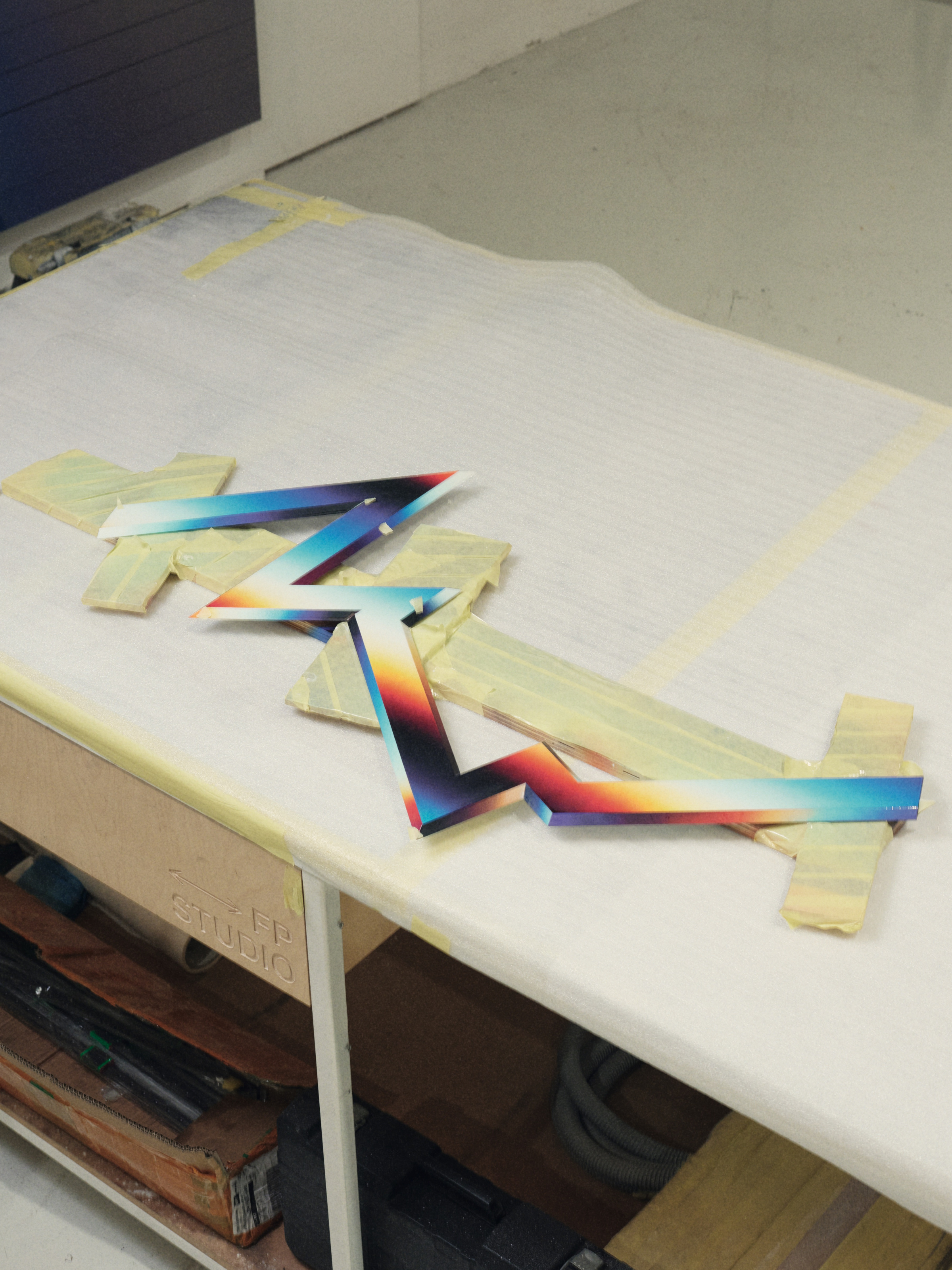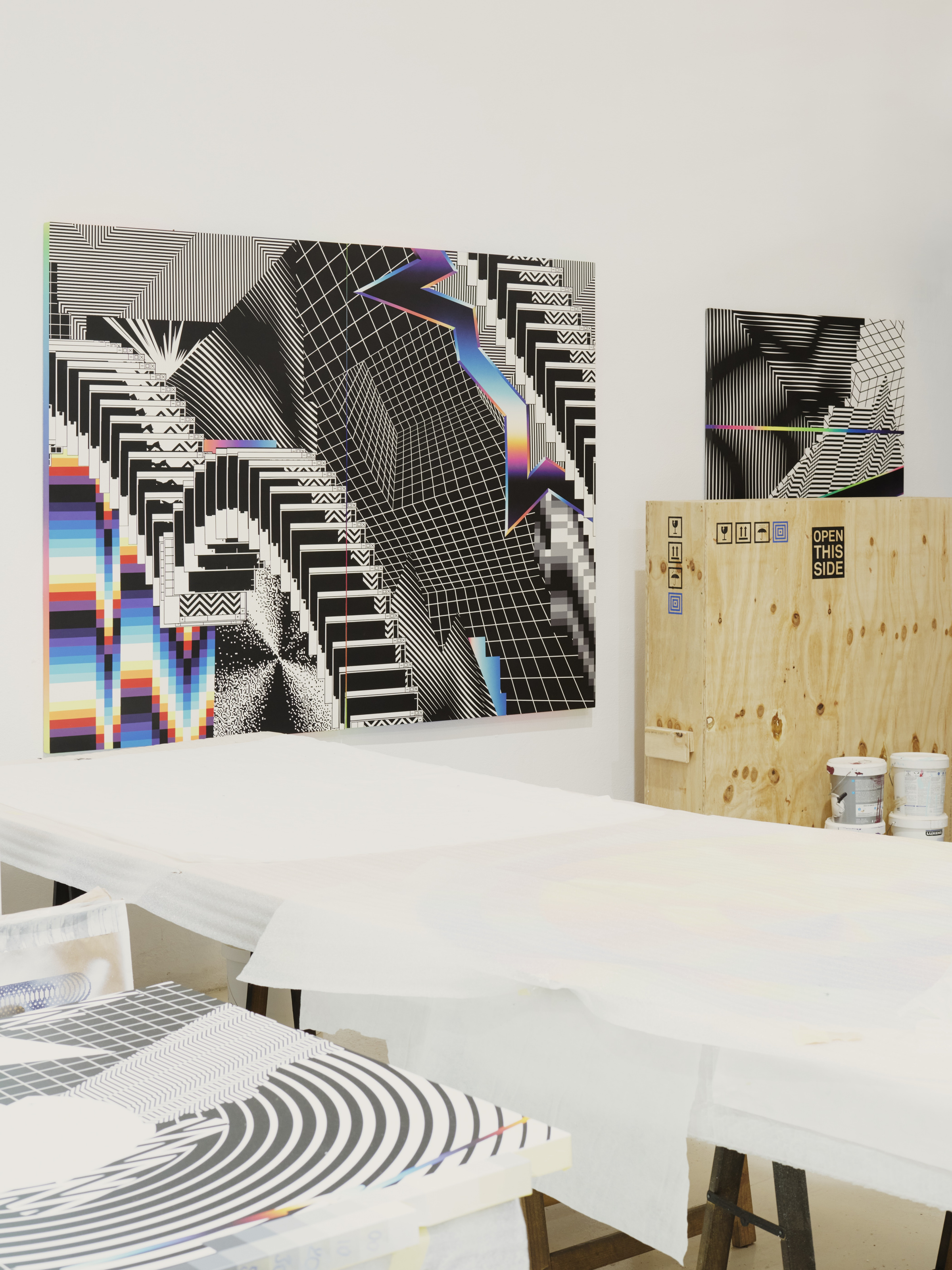 - In process zigzags and colorful shapes fill the studio. Photo by Luis Ayora