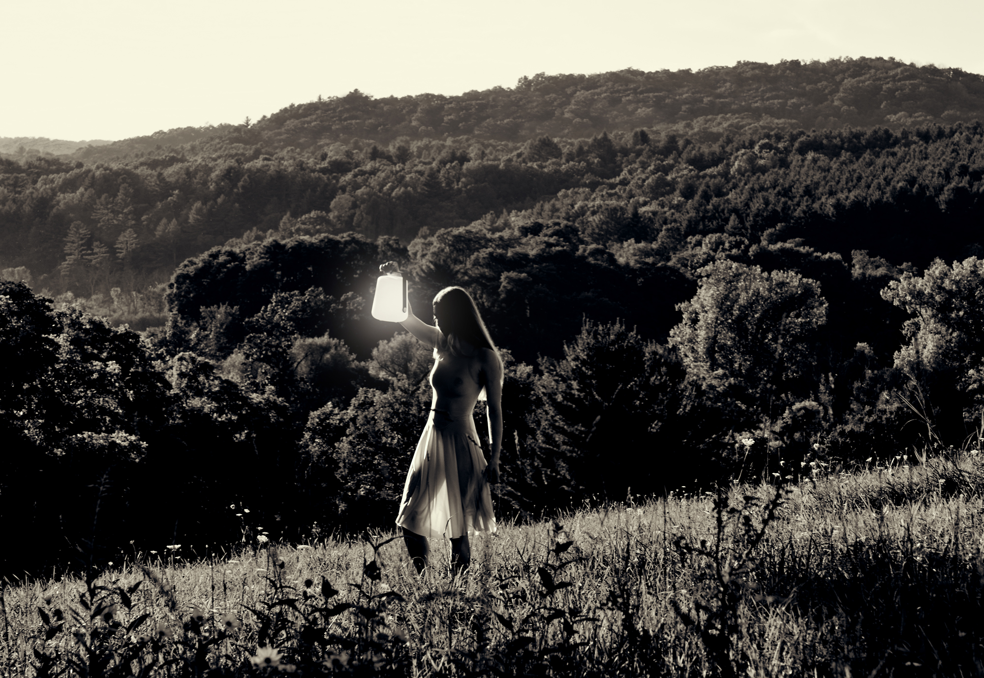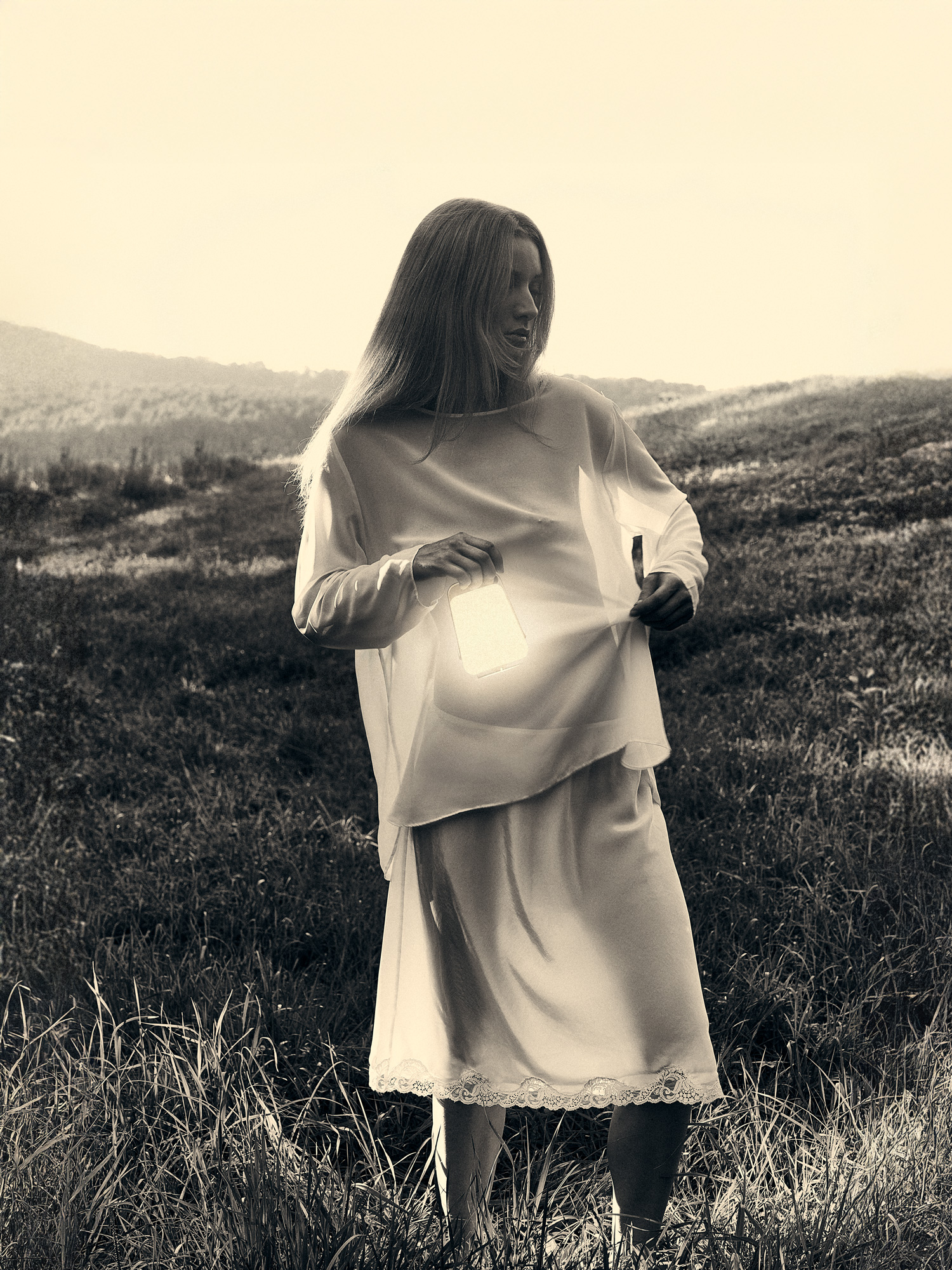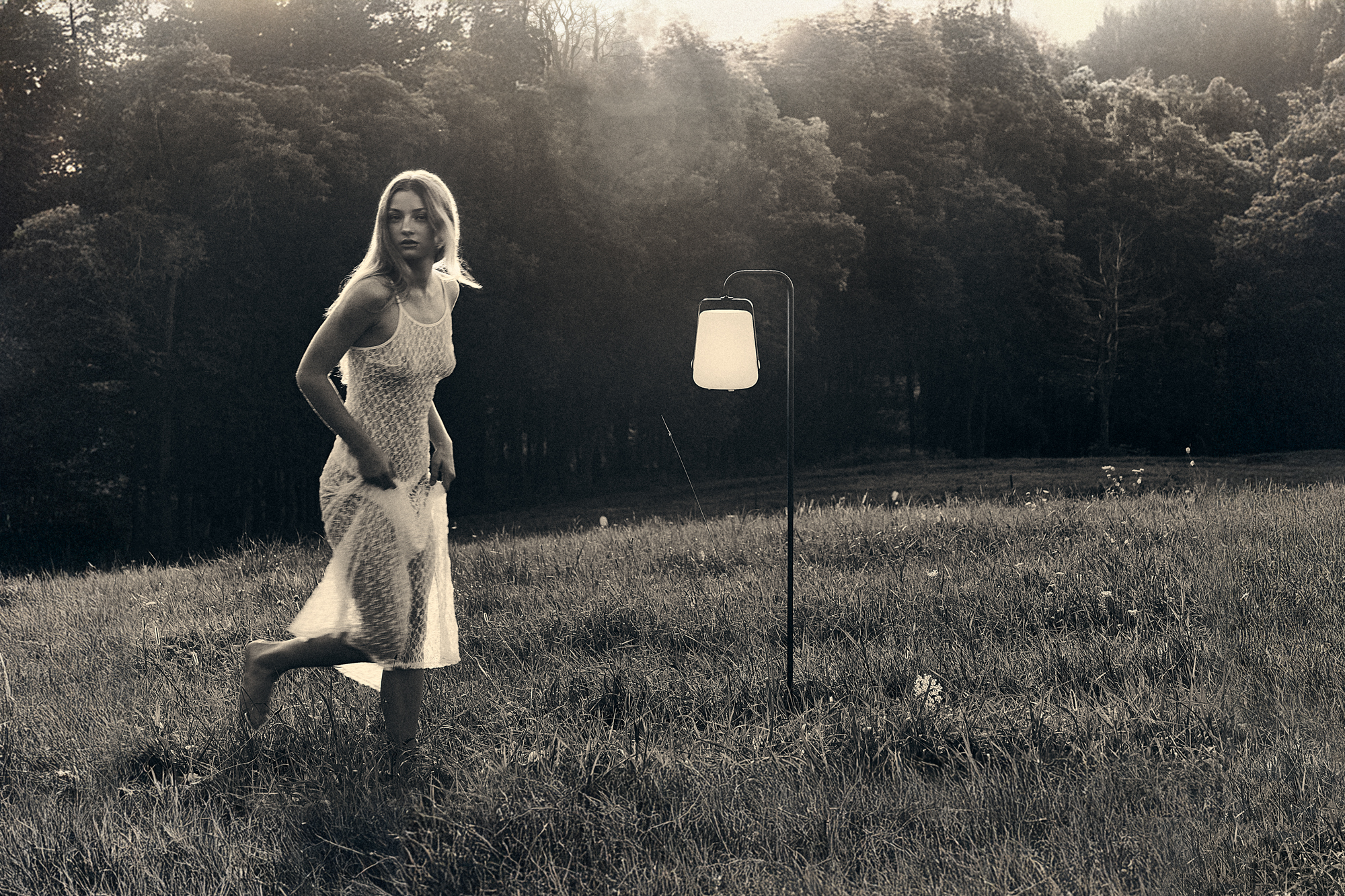 Flowing garments and FERMOB lighting meet open fields, where gathered sun becomes something to carry and wander with.
