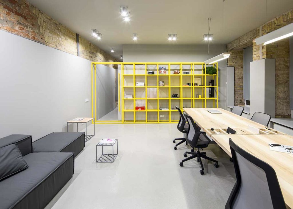 A room inside FILD’s office and store, in Kiev, shows off the characteristic grey-and-yellow color scheme.