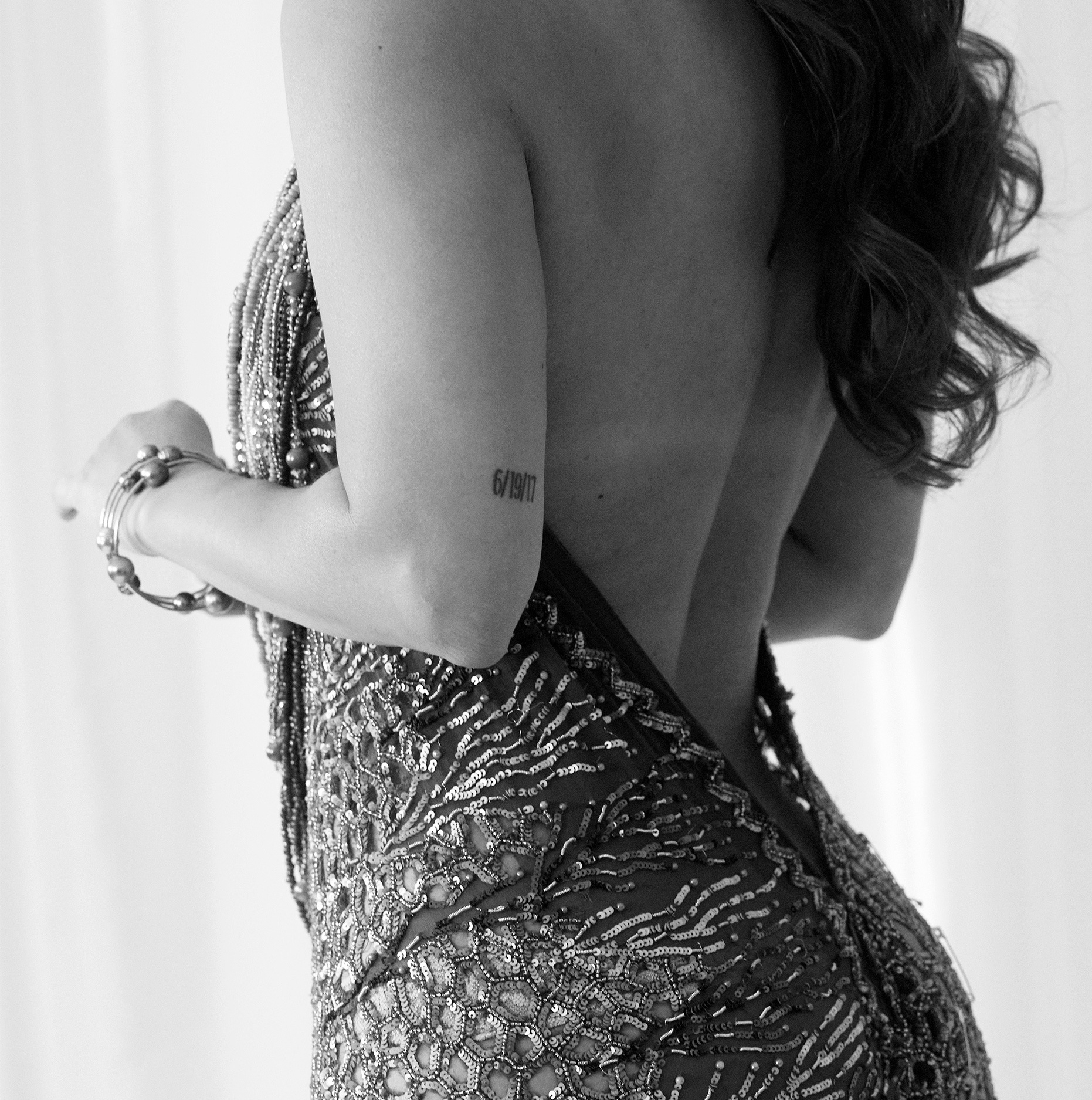 Dress: Hervé Léger. Earrings: Federica Rossi Jewels. Shoes: Jeffery Campbell