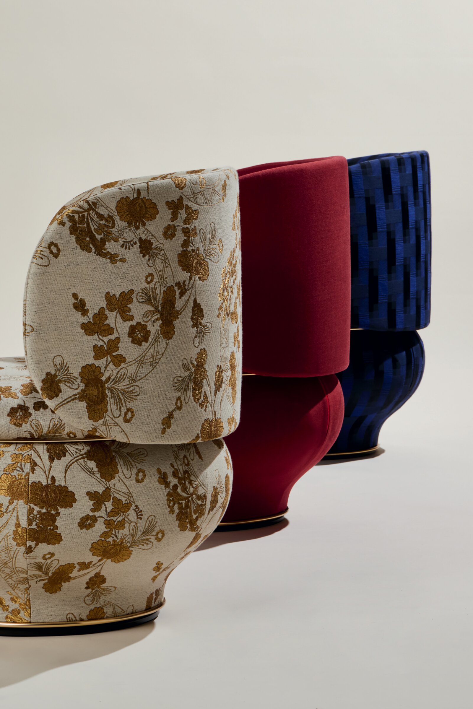 Luca Nichetto, a product designer trained at glassware factories in Murano, conceived the Domus collection. To finesse the light fixtures, chairs, and cabinetry, Luca brought in master craftsmen from Barovier & Toso, a Murano glass foundry established in 1295, and Rubelli, a fabric house founded in 1889. Tapping into each company’s legacy, which spans more than 700 years, Luca incorporated some of their most distinctive products into Domus: Ginori 1735’s Orientate Italiano floral pattern, Barovier & Toso’s mouth-blown Venetian crystal, and Rubelli’s jacquard textile.