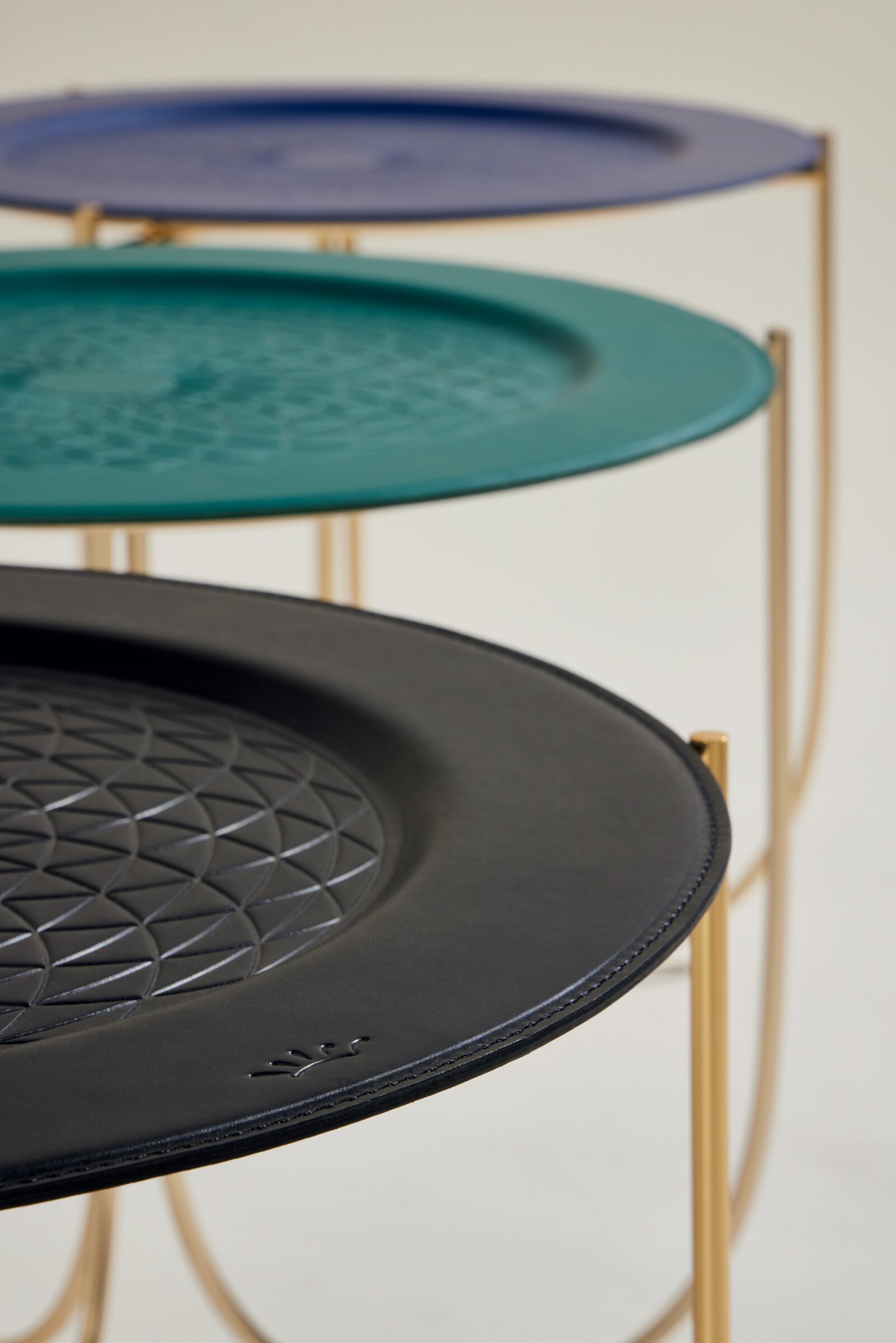 Another historical reference is located in the Optique tables, which balances a fine grain leather tabletop on arced, bent steel legs. A radial arrangement of geometric shapes is imprinted into the leather, a pattern that comes from the floor of the Baptistery of San Giovanni in Florence, constructed in the 11th century. The legs, which look like they may teeter over, reference the cathedral’s archways, and their golden color matches the iconoclastic halo that surrounds the fresco of John the Baptist.