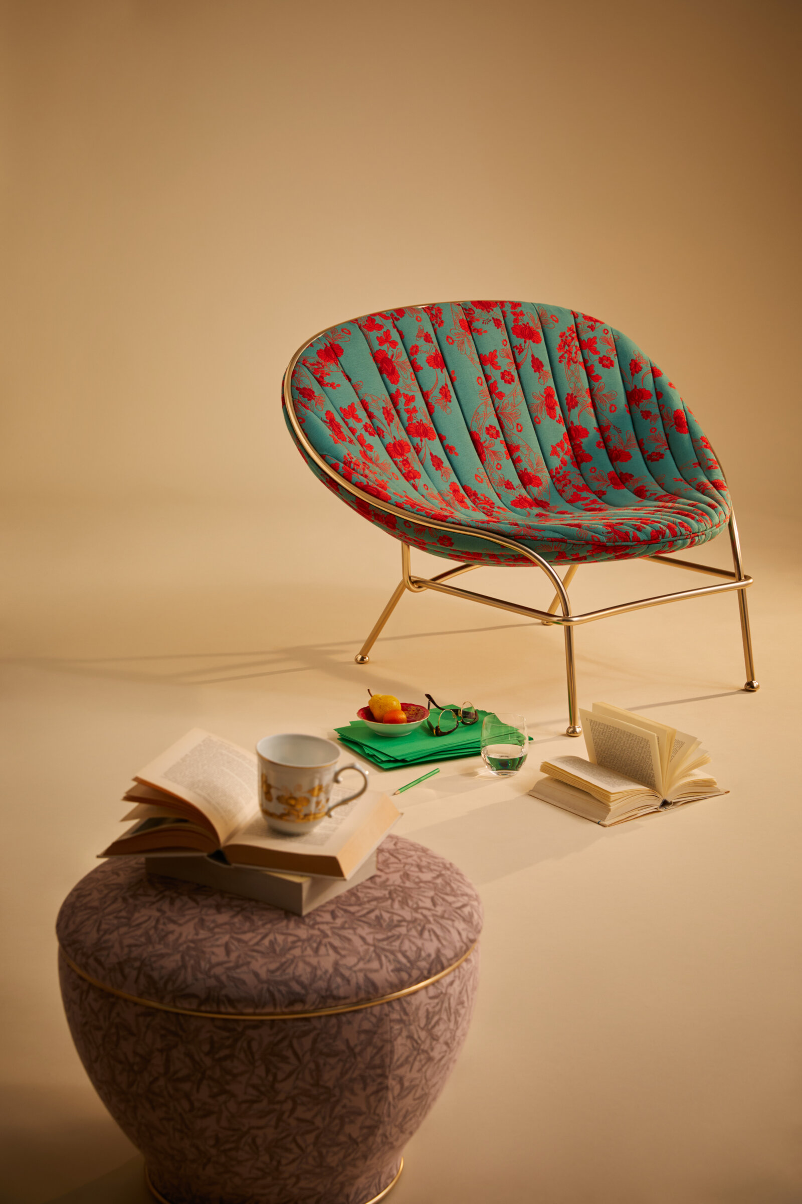 - Dulci poufs in Ginori 1735’s famous Orientate Italiano floral pattern, manufactured in jacquard fabric by Rubelli.