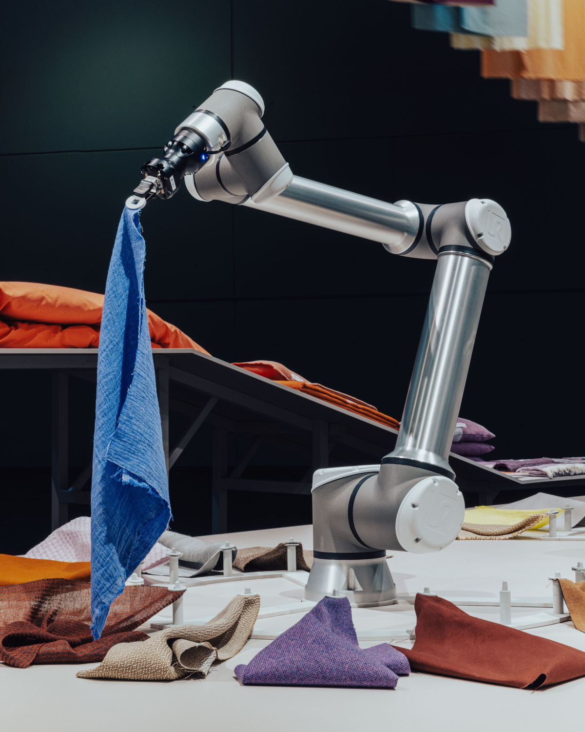Joseph Grima’s studio Space Caviar designed this exhibition with swatches of textiles on a conveyor belt-like white table, a laundry line of fabrics circling overhead. Robotic arms designed by Studio AATB, designers Andrea Anner and Thibault Brevet, “play” with the fabrics. Photo by Piergiorgio Sorgetti