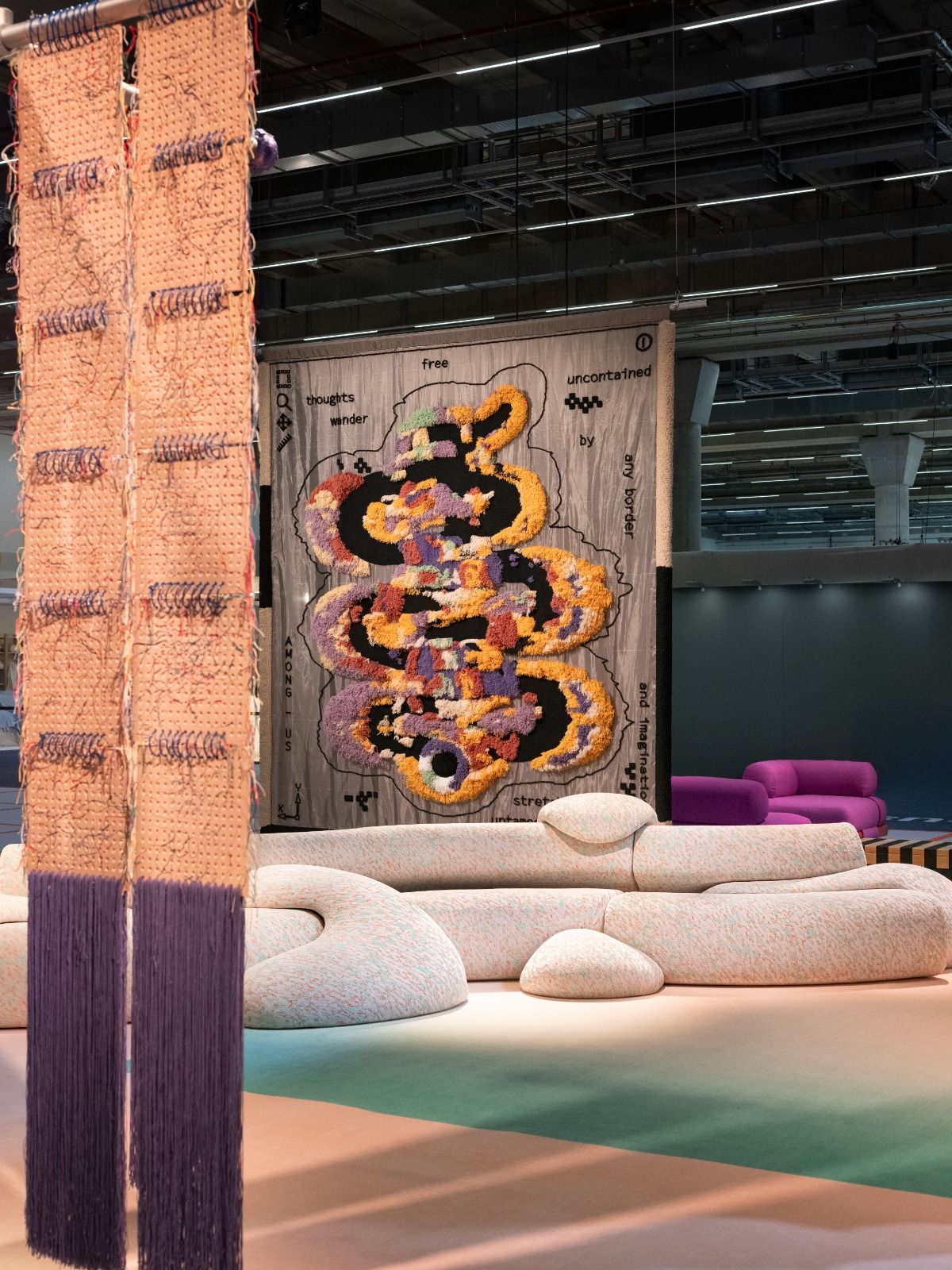 “There is no one future. There is a lot of different research to be blended together. Let’s put together what we can do at this moment,” Patricia explained, standing in the installation’s outer section, a digital-like grid topped with vibrant lilac and magenta Kettal Insula sofas. She led us to the vertical tapestries depicting “gentle monsters”—inspired by worms, buffaloes, and let your imagination decide what else—which were digitally designed and made with cc-tapis’ tufting robot.