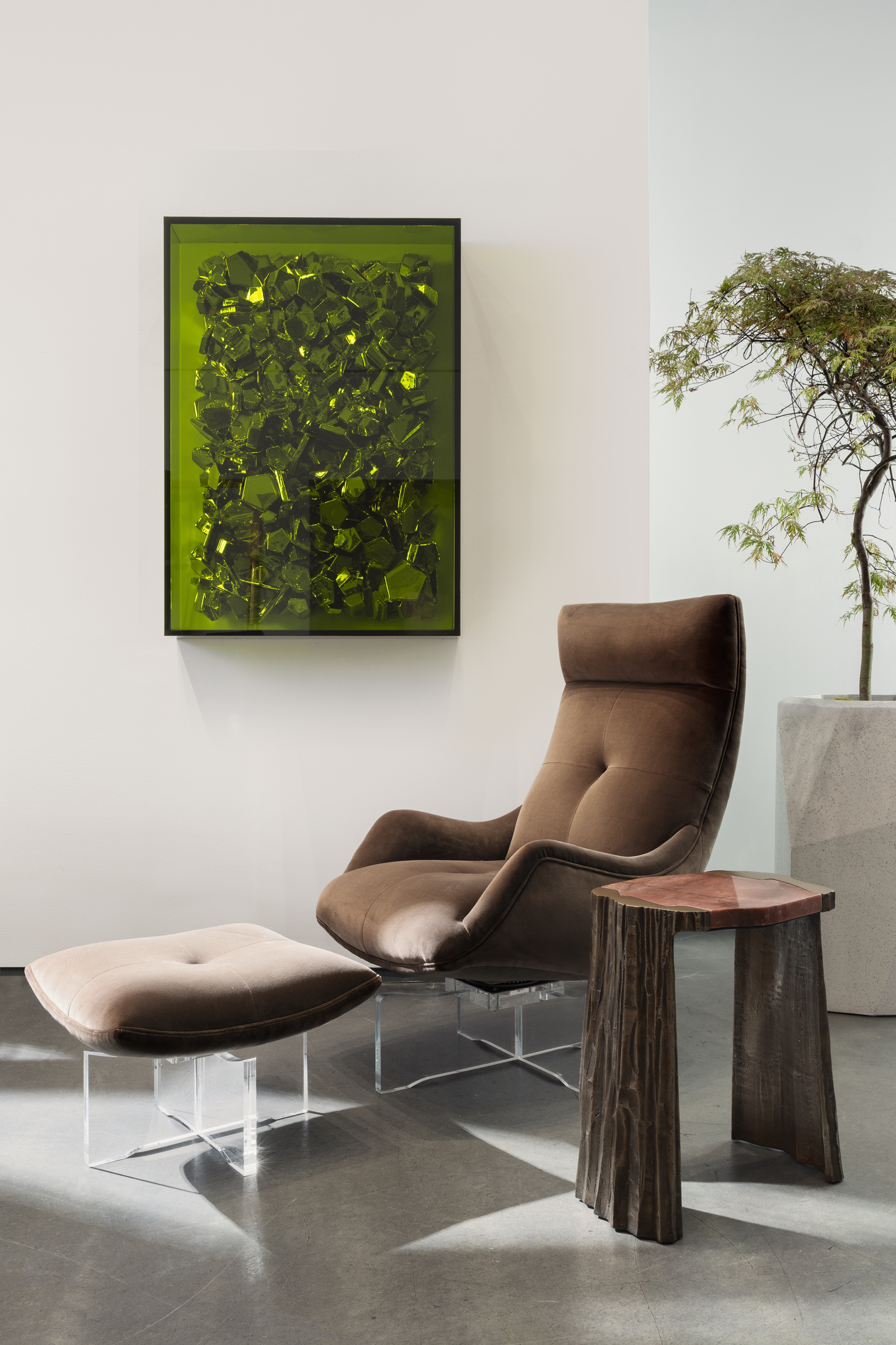 HH40 mixes multiple eras of design history into the collection. With its deep-set cushion and fixed slant, Tubac Lounge Chair draws inspiration from mid-century modern design, whereas the brass bars running across the mosaic-style fused and slumped glass on the Strata Chandelier takes notes from Frank Lloyd Wright’s Prairie Style architecture. The teardrop surface on the Ripple Side Table brings in a touch of Memphis, and the curvy frame on the Caldera Cocktail Table, modeled after volcanic craters, goes all the way back to the Mesoamerican civilizations.
