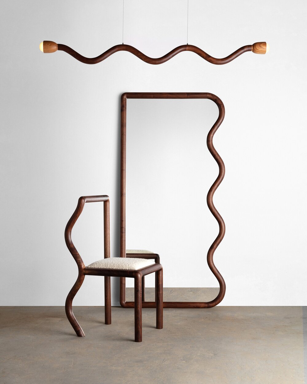 - Squiggle Mirror, Light, and Chair. Photo courtesy Christopher Miano.