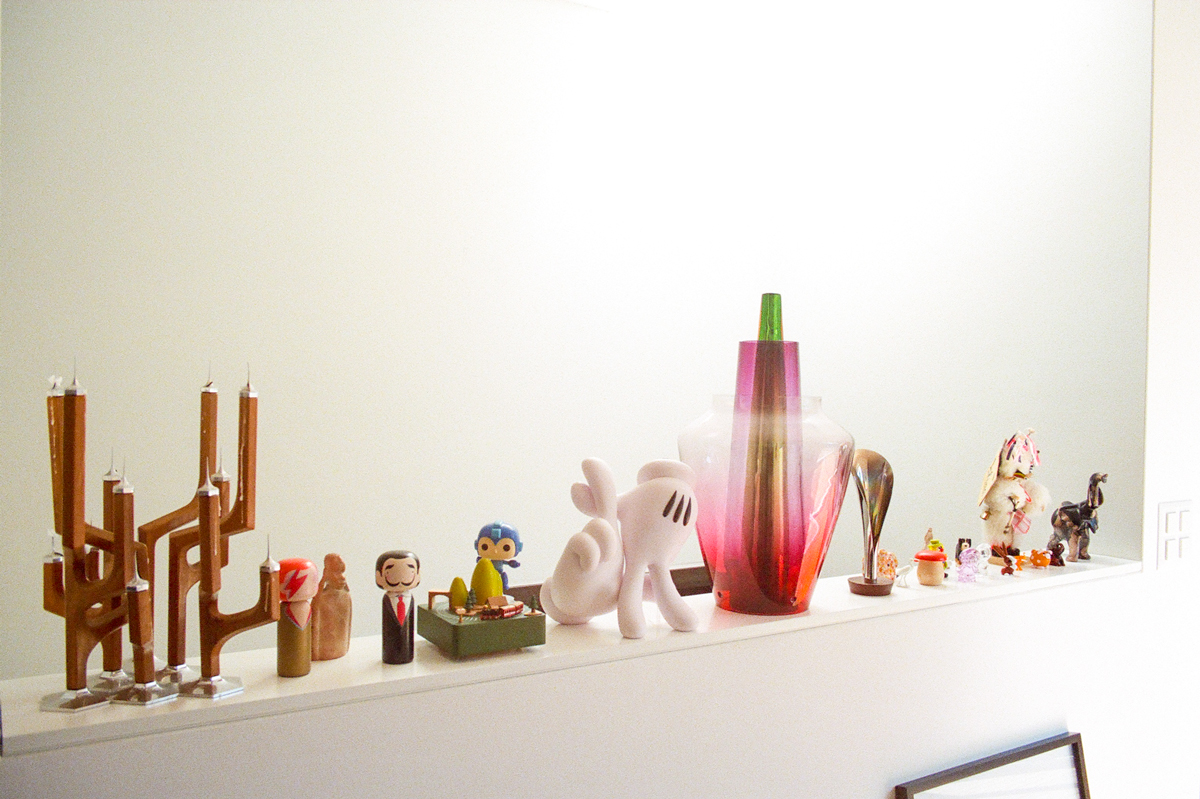 Back in Ini’s apartment, light reflected off the art collection in his dining room—bright yellow ceramic lemons, a glass-blown red mushroom from Italy, pieces by LA graffiti artist OG Slick. His own creations balanced gracefully on shelves, crowded around tables, or dangled above.