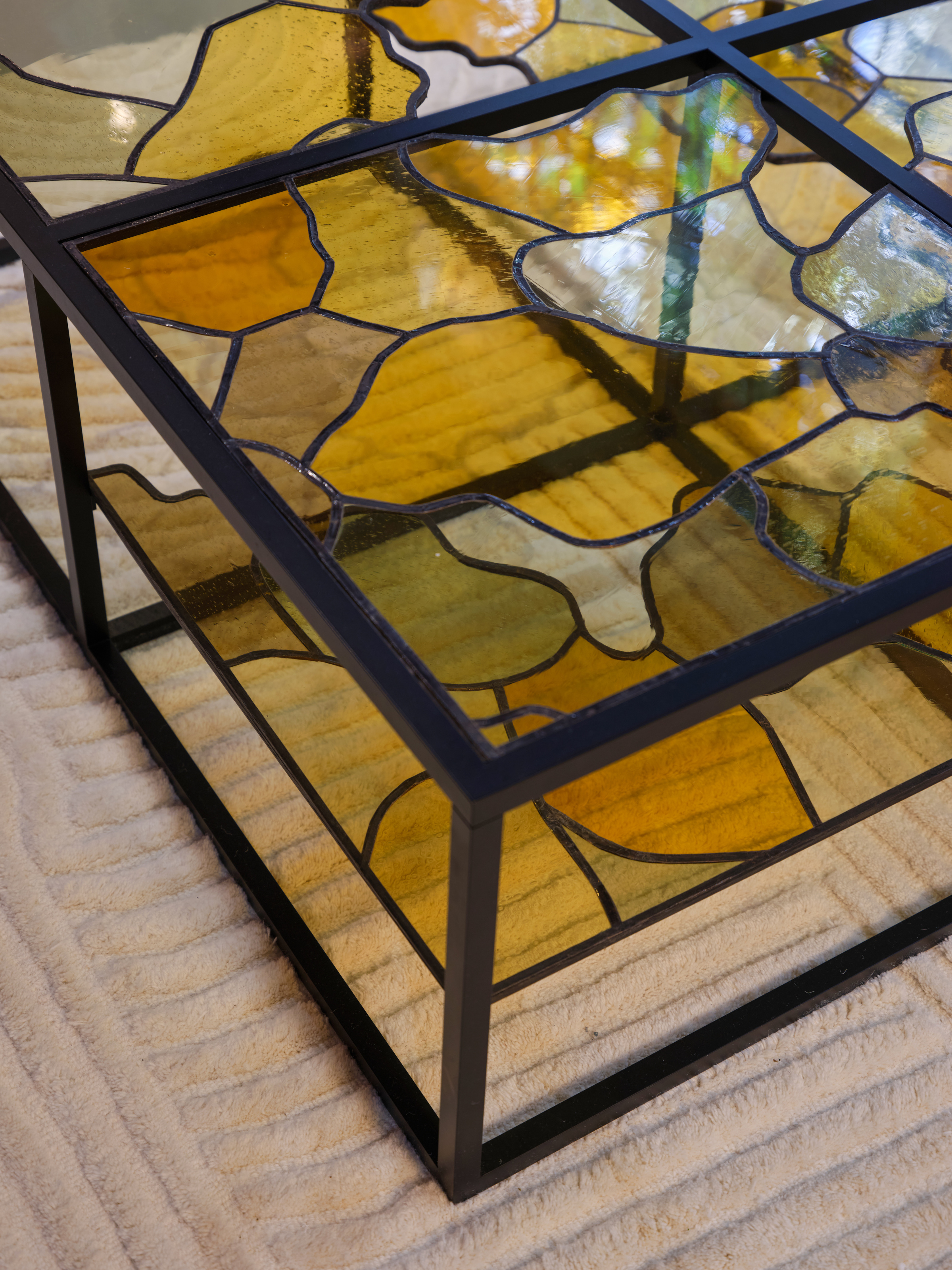 Gregoire used stained glass to highlight a traditional craft that’s deeply tied to French history. But instead of using it vertically like in windows, he decided to try something different by using it horizontally as a table surface to give this old technique a fresh, modern spin.
