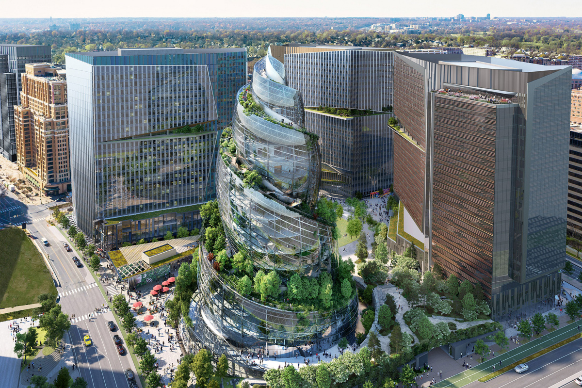 NBBJ is designing a spiraling glass tower with an outdoor hiking trail for Amazon’s HQ2 in Arlington, Virginia.