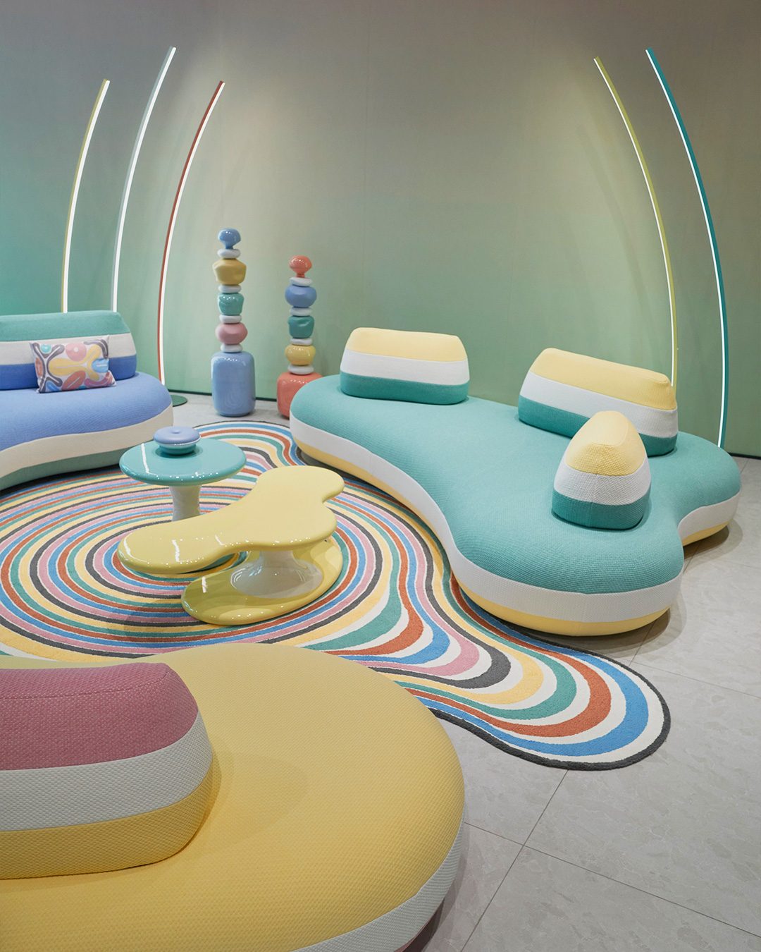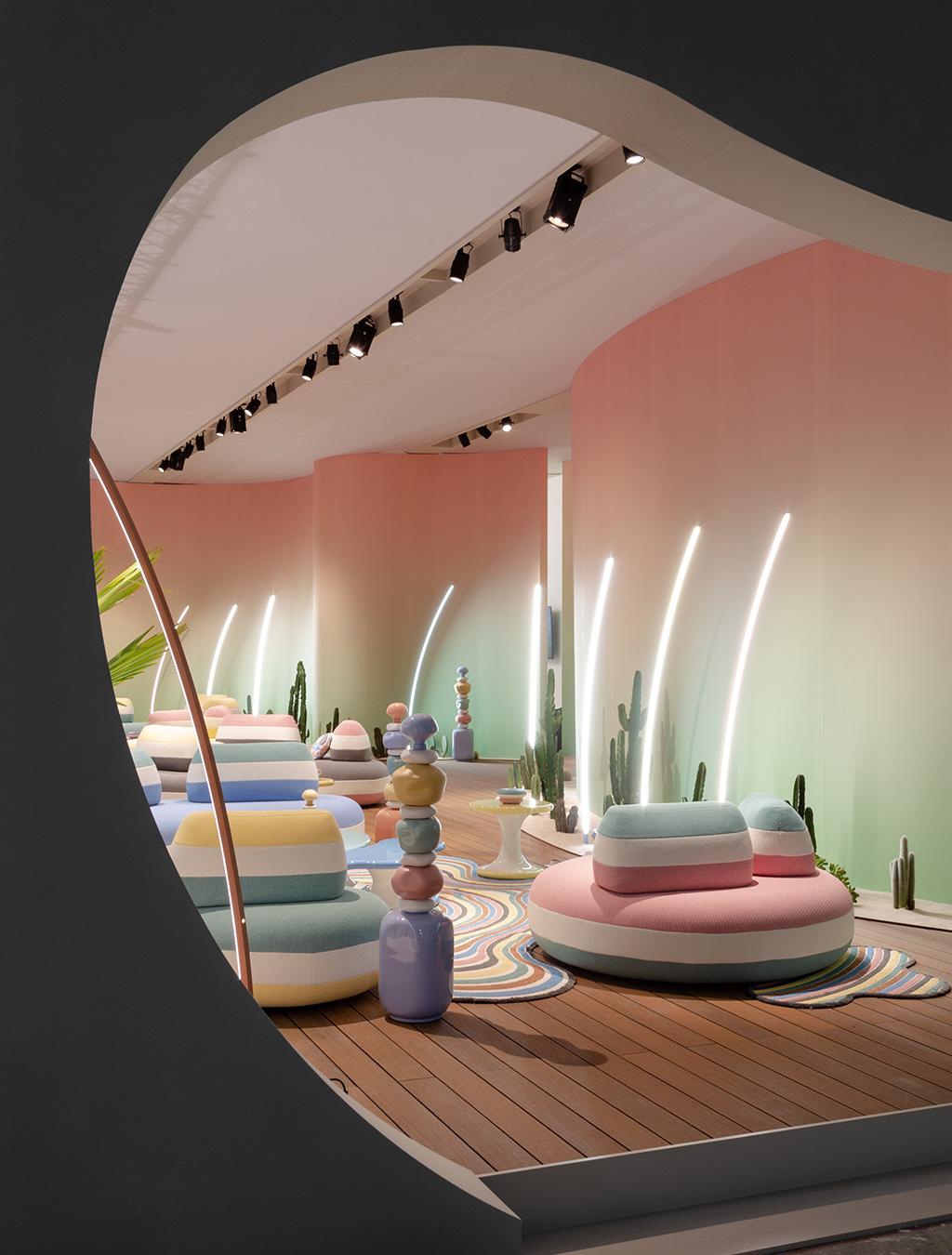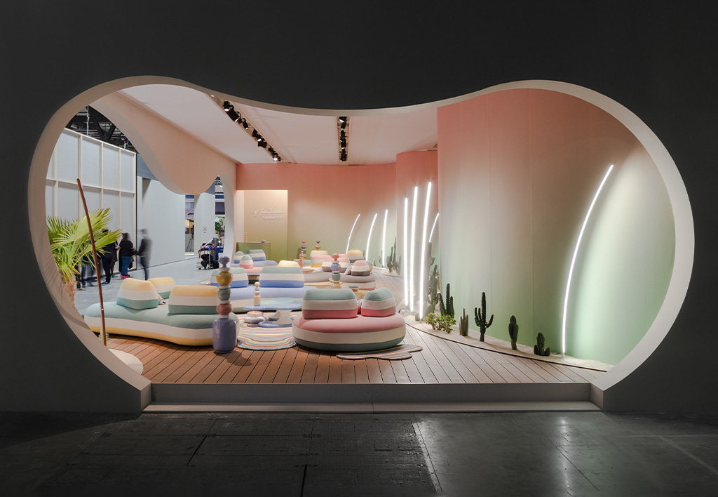Roche Bobois accentuates the showroom with curved neon lights, cacti and pebbly, stacked vases that resemble cairns on a hiking trail. They transport you from Portugal to Joshua Tree, all while you remain grounded in Milan. By using a color palette that spans from the Mediterranean to the Southwest, Roche Bobois emphasizes the interconnectedness of nature and culture.
