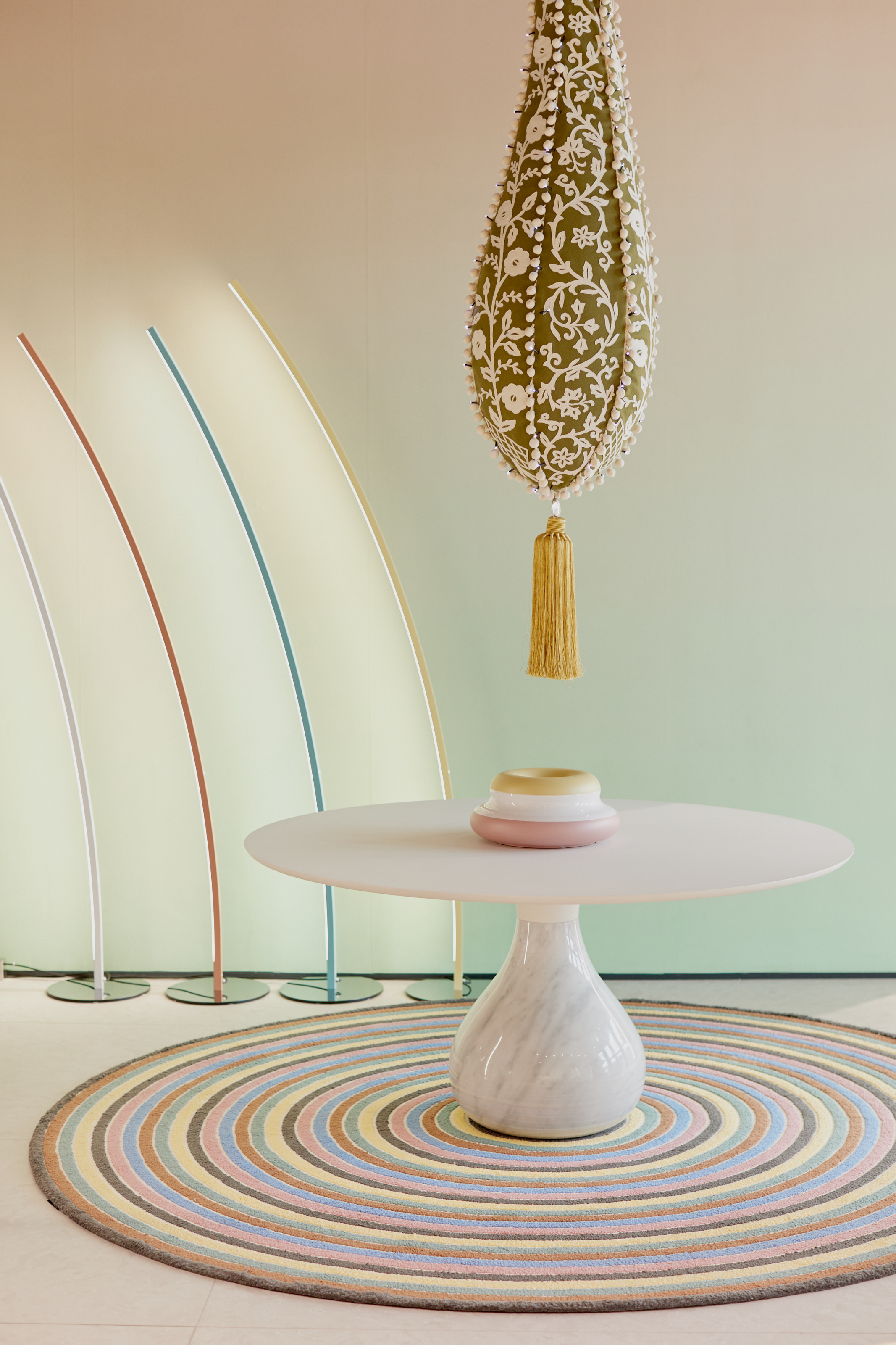 One can find these staples of Roche Bobois’ catalog in the Milan flagship by following a serpentine, 150 foot sculpture that Vasconcelos is exhibiting in the space for one month. Visible from the street, “Valkyrie” is formed with crochet, fringe, lace, ornaments, sequins, and LED lights. It begins with the same pastels as the BomBom Outdoor collection, but transitions into color palettes more suited to other Roche Bobois pieces as it moves from one room to the next. It even hangs over Vasconcelos’s iteration of “Mah Jong,” created in 2019, which features deep, velvety jewel tones and bold, black stripes.