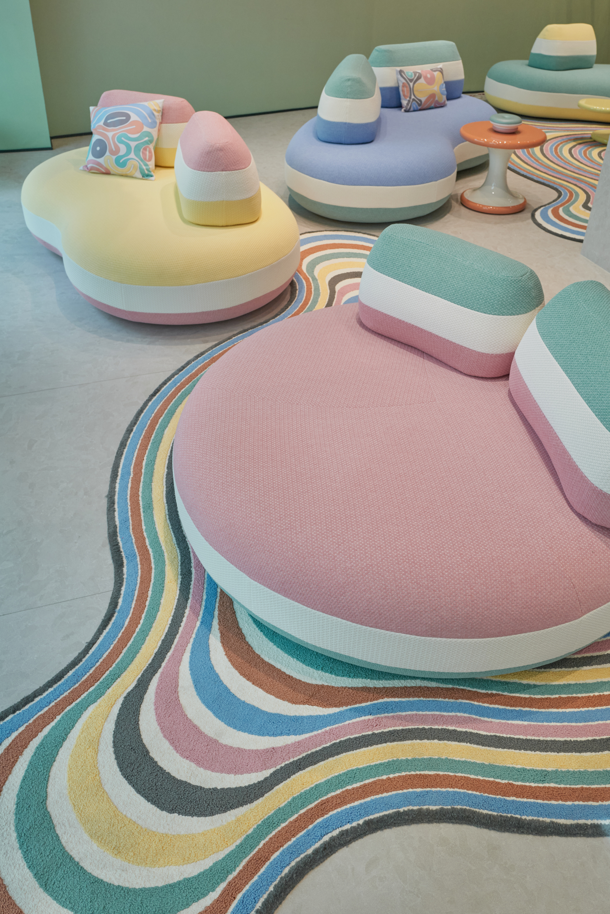 The showroom, which exceeds 1,700 square feet, emulates sunrises and sunsets through its arrangement. The most prominent collection is BomBom Outdoor, which just premiered at Milan Design Week. It’s a brightly layered, colorblocked offering of sofas, rugs and cushions. Vasconcelos studied the hues of Lisbon’s architecture to come up with the furniture’s soft pinks, blues and yellows, and the colors band and stack on one another to evoke the peaceful gradient of a Portuguese sunset. The curved forms echo the way sunlight bleeds through alleyways and across cobblestones. Each has a sturdy, modular headrest that loungers can move around to offer the best view of dusk from the comfort of their backyard.