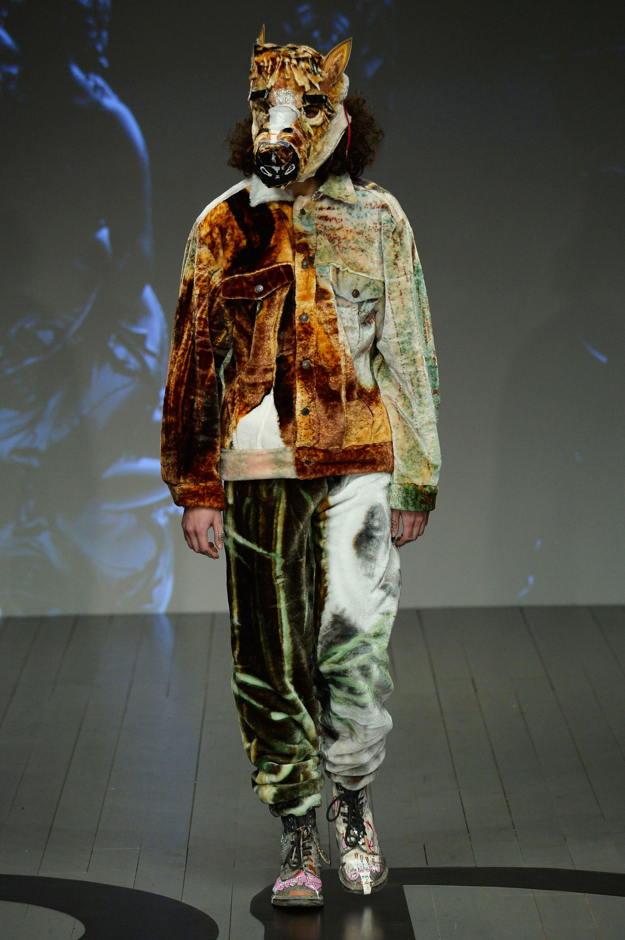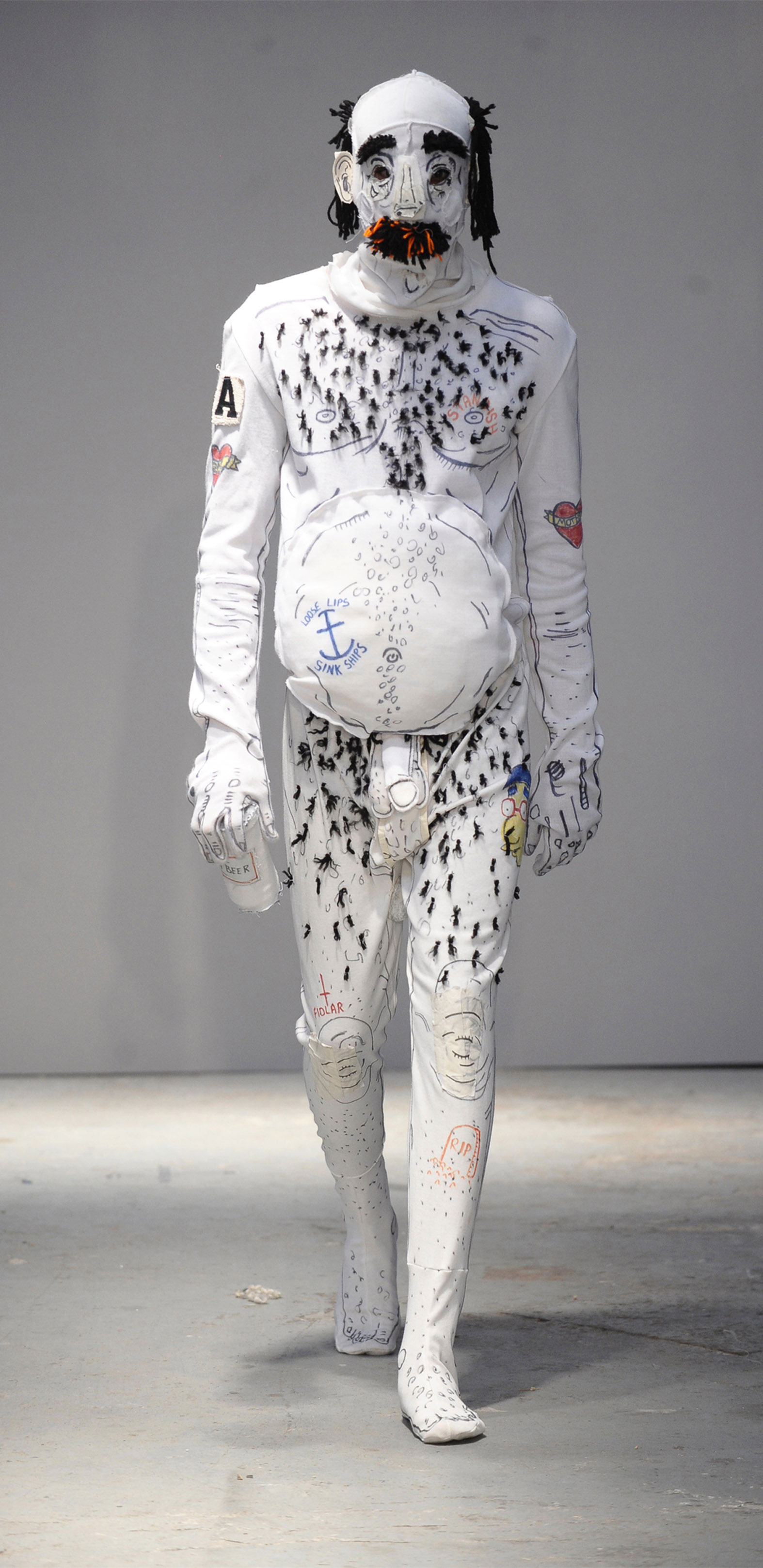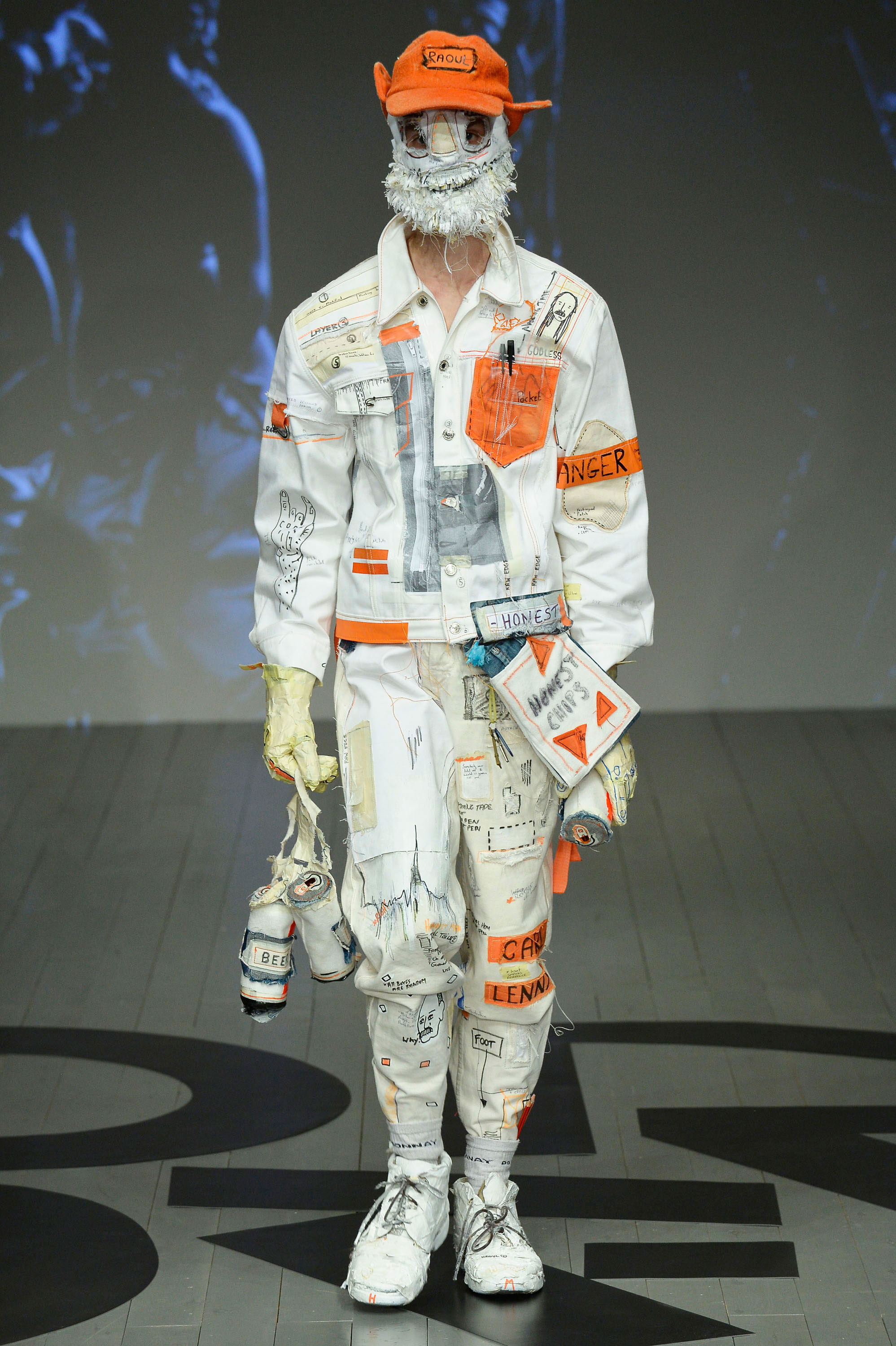 “For the honest men, the beer drinkers, chainsmokers, piña coladas, good guys, tall guys, all guys, the 5’9”’s and the 9 to 5’s … All are welcome,” writes fashion designer and London College of Fashion graduate Joe Standish in his online bio. His Honest Man line isn’t just a collection of garments, well-designed and executed with recycled and repurposed elements; it reflects an ethos and a desire to replace the fast-fashion template with something more playful. Each piece comprises reworked denim—shredded or otherwise distressed—awash with vibrant oranges and whites, marking his work as distinctive, high-spirited, and DIY-infused. While creating clothes—and even characters—that feel more authentic than many of those by his contemporaries, Standish has also developed a career on an above-commercial level.