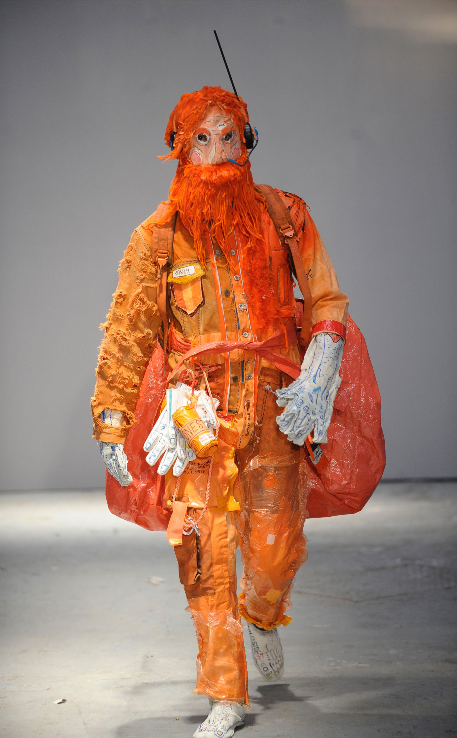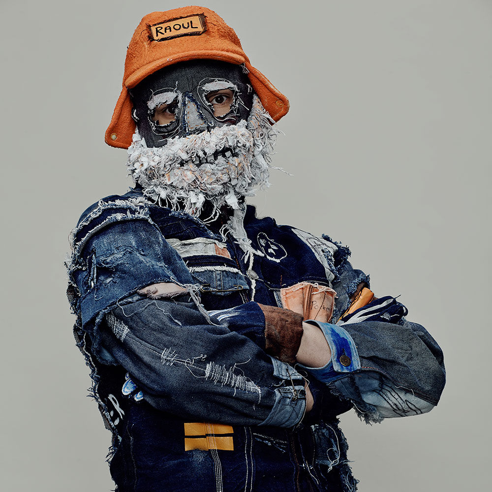 “For the honest men, the beer drinkers, chainsmokers, piña coladas, good guys, tall guys, all guys, the 5’9”’s and the 9 to 5’s … All are welcome,” writes fashion designer and London College of Fashion graduate Joe Standish in his online bio. His Honest Man line isn’t just a collection of garments, well-designed and executed with recycled and repurposed elements; it reflects an ethos and a desire to replace the fast-fashion template with something more playful. Each piece comprises reworked denim—shredded or otherwise distressed—awash with vibrant oranges and whites, marking his work as distinctive, high-spirited, and DIY-infused. While creating clothes—and even characters—that feel more authentic than many of those by his contemporaries, Standish has also developed a career on an above-commercial level.