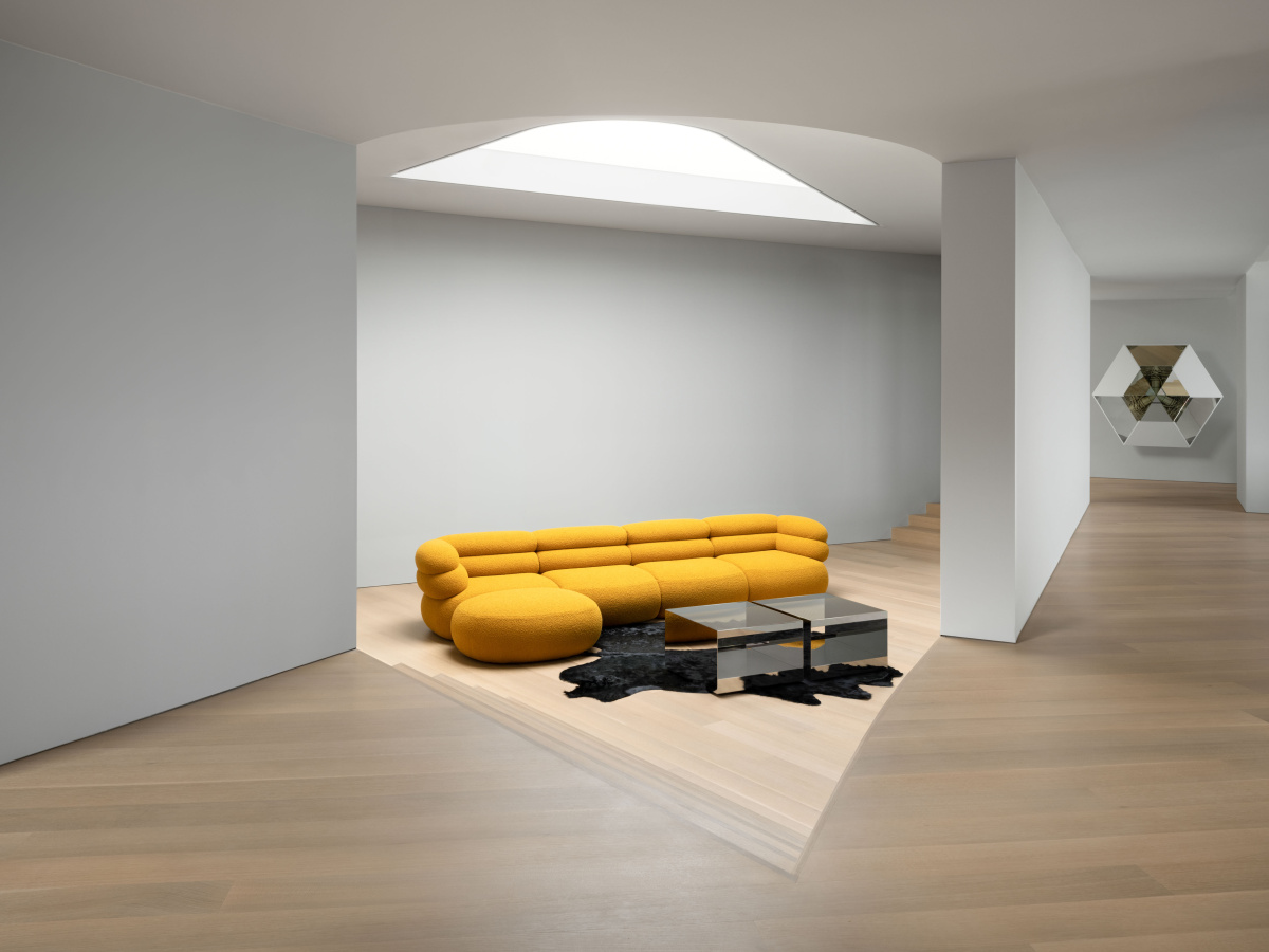 “Oftentimes sofas are pushed up against a wall and frame the space from the front,” Sharon says. “We really thought about it as being an object that is beautiful in its proportions, such that being able to see it and inhabit it on all sides. It’s friendly in the way that it encounters other pieces of furniture from other eras.”