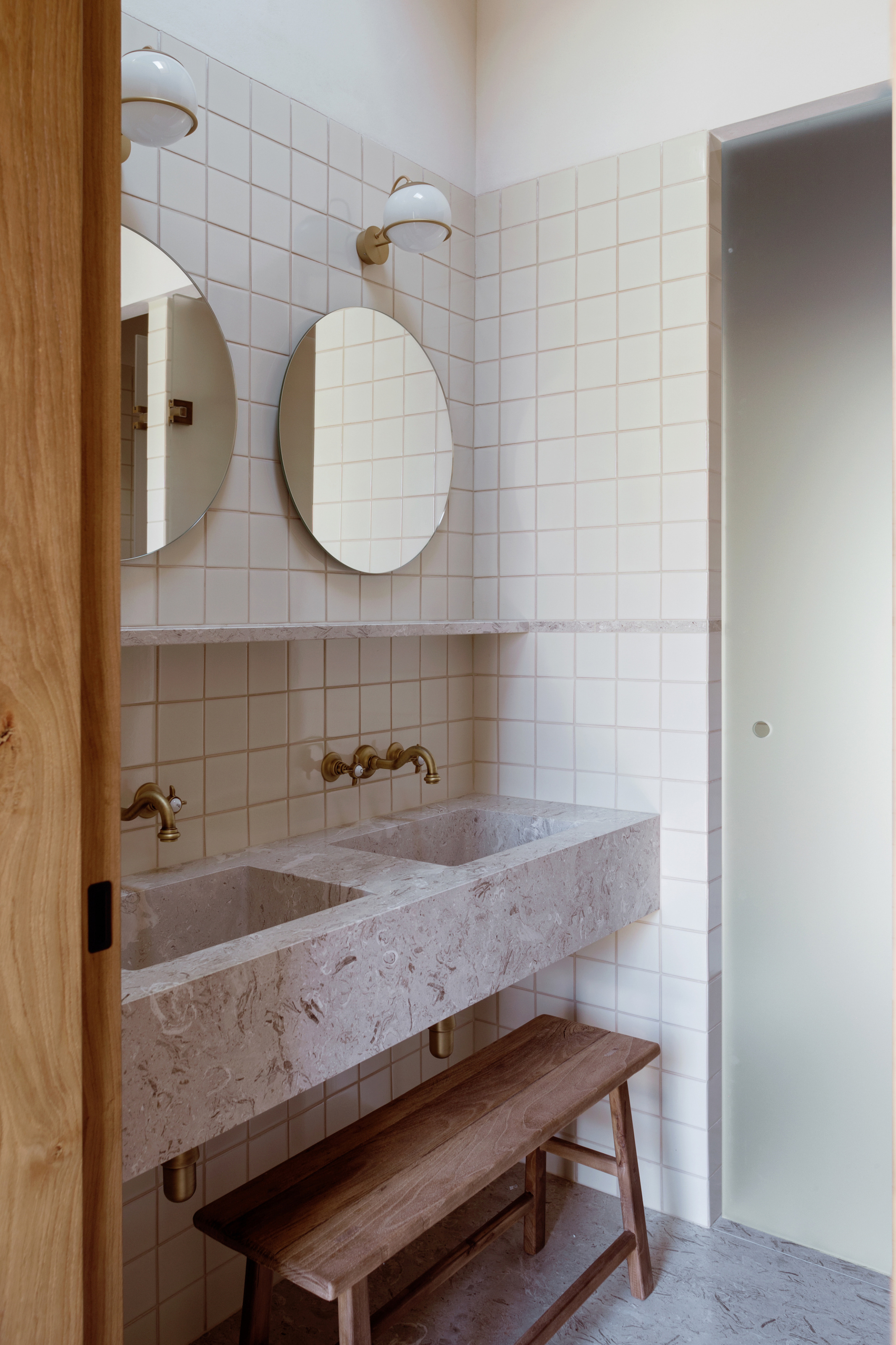 Upstairs, the bedrooms have also been repositioned to take advantage of the southeastern views. The three rooms each have an en suite bathroom with deep, marble basins and brass faucets that match the globular vanity lights above. Hard and soft textures—timber, stone, and steel—alternate throughout the floor, converging on a balcony that runs along the three suites.
