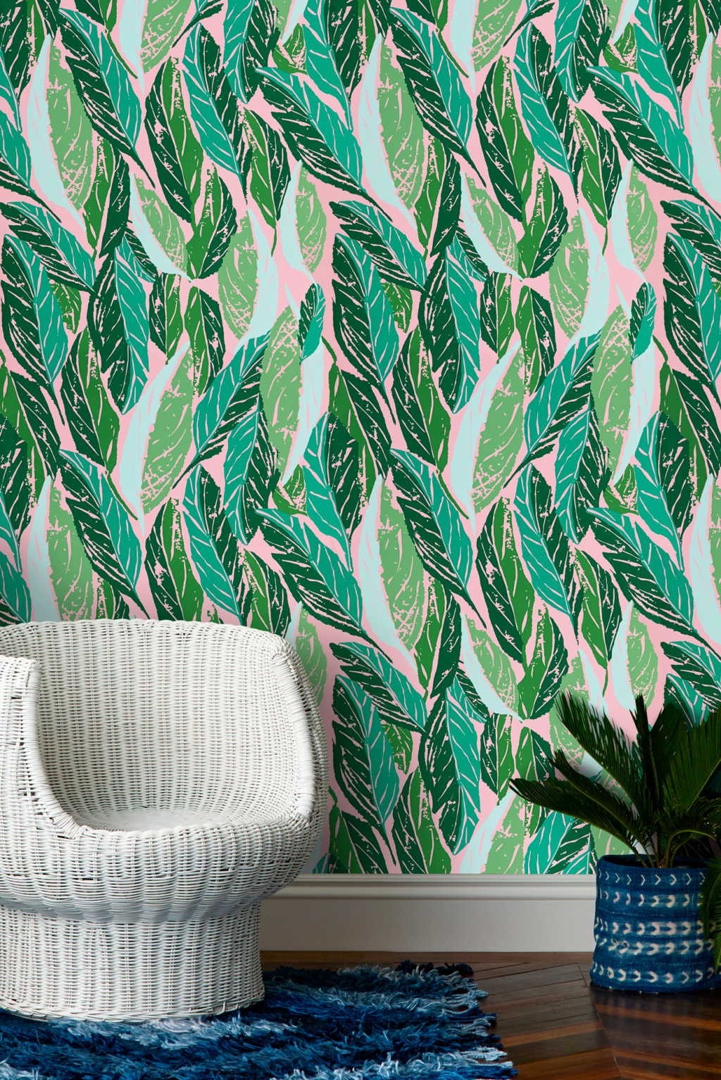 Nana, the green and pink wallpaper design, was inspired by the regal leaf of the banana tree.