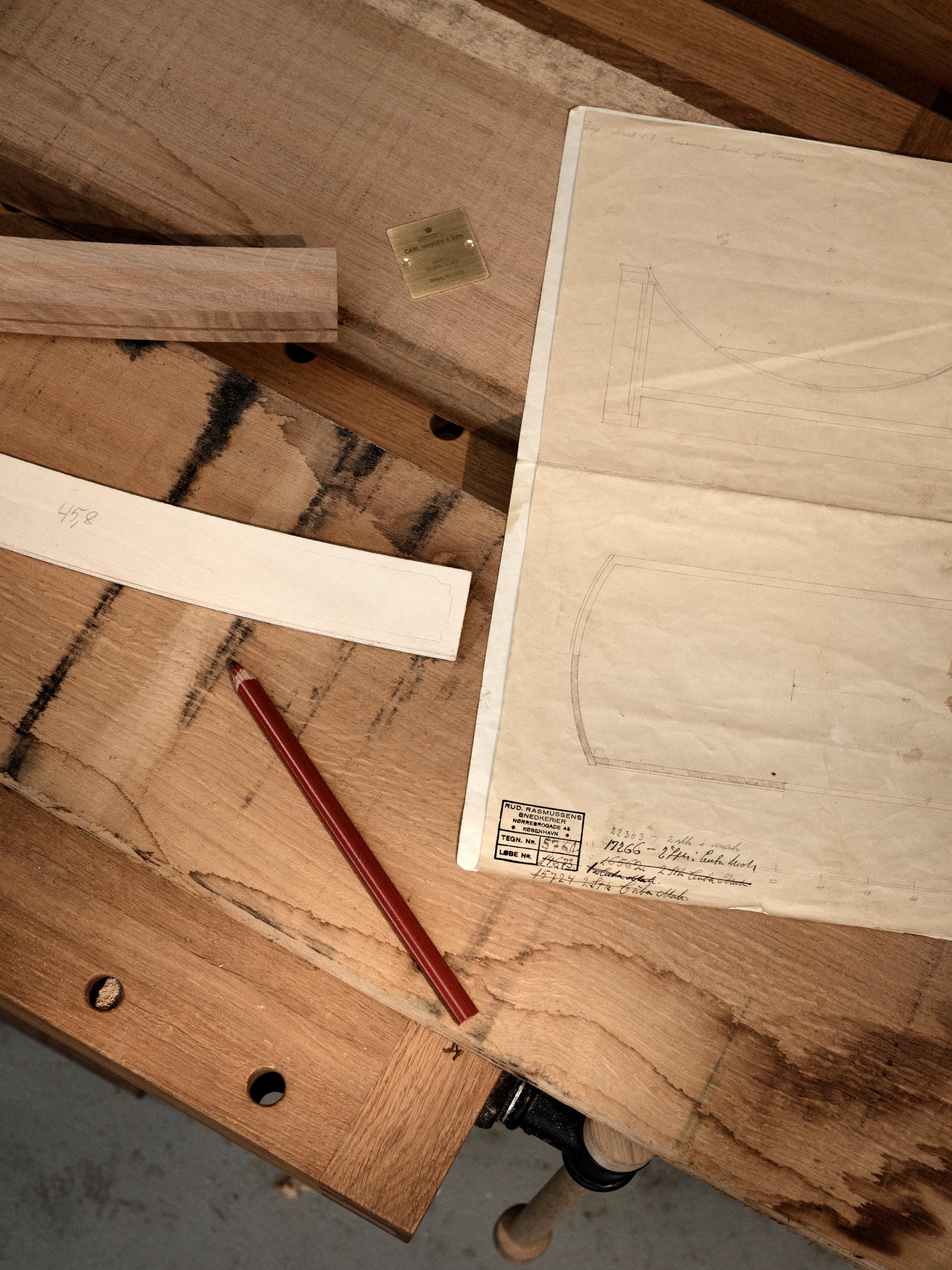 Production Supervisor Jeppe Ravn Frederiksen and Project Coordinator Martin Tolberg Møller say they began the redesign process by piecing together the one-person bed from Kaare’s original drawings. “The sketches we used are part of the bed’s history, showing the marks and notes of cabinetmakers from the time,” Martin says. “We digitized the old calculations, and even though we used modern software, all of the original measurements were correct. It was incredible how accurate the designer had been.”