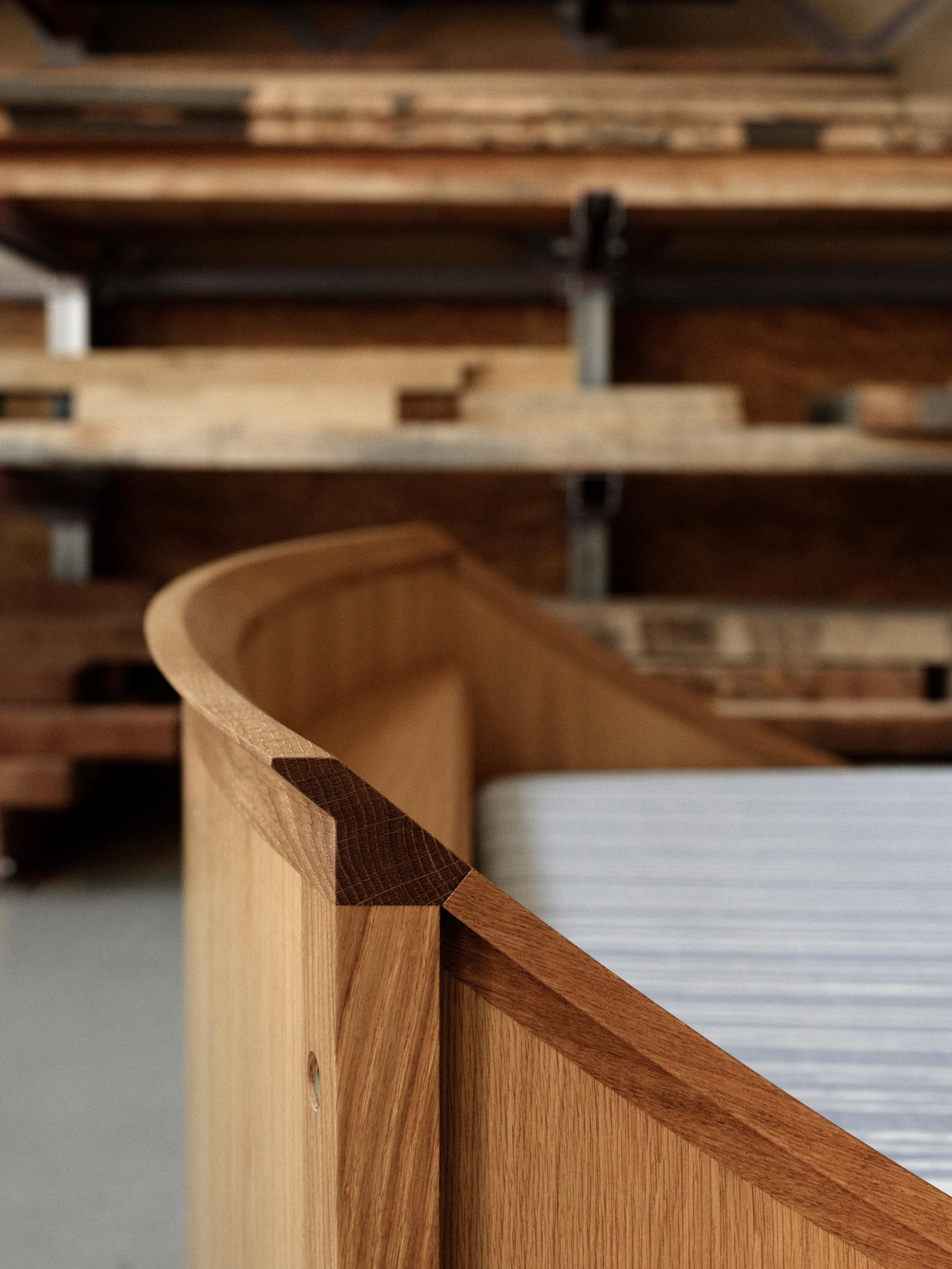 Described as “a mathematical stroke of genius,” the space between the Spherical Bed’s headboard, footboard, and sides follow the shape of a fictitious sphere, mirroring its rounded edge. Expanding to a double size would be a careful process. “Once we could calculate the one-person bed’s geometric shapes, we had to pull the dimensions outward,” Jeppe says. “It was nerve-racking,” Martin admitted, describing the pressure to maintain the original bed’s essence while evolving it for contemporary tastes. “Before launching the double bed we hoped people would love it as much as we do. We even consulted the Klint family for approval.”
