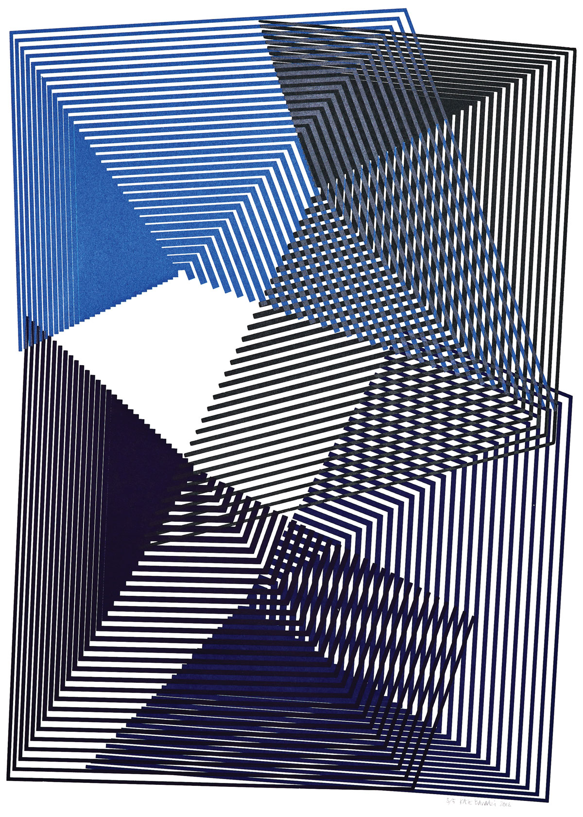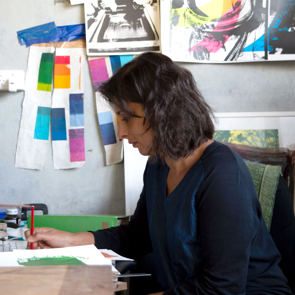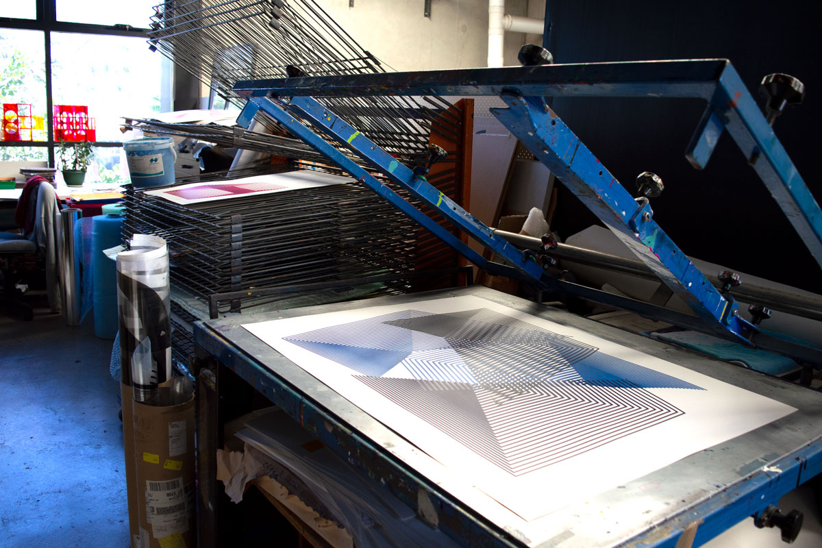 “So, what you’re telling me is you don’t know what you like, or why you like it, you just know what you like when you see it?” This, hurled at me by an overeducated, under-successful graduate school art professor, hit me dead between my eyes. “Um, yeah,” I replied. My theory improved, my tongue sharpened, my skin thickened, but grad school was not for me. To this day I frequently like—love even—the works of artists and designers without always understanding why I’m attracted to them. Sometimes you just get a feeling about someone’s work, or process, and you give it a little more patience than you normally would—and your admiration develops. It’s difficult to ignore work that is the product of brutal, intensive labor, crafted by hand during hours of introspective and isolated studio time. Without knowing Kate Banazi, but just by looking at her work, I knew she’d check these boxes. You know it when you see it. Despite maintaining a meticulous and demanding studio practice, Kate believes in embracing the accidents that come from screen printing. Rather than touch up minor imperfections in her prints, the London-born, Sydney-based illustrator and printmaker prefers to let the flaws be. The process, patiently layering screen after screen to create an image, reveals her intent, a harmonious kind of beauty, where geometry, color, light, and layers complement each other.
