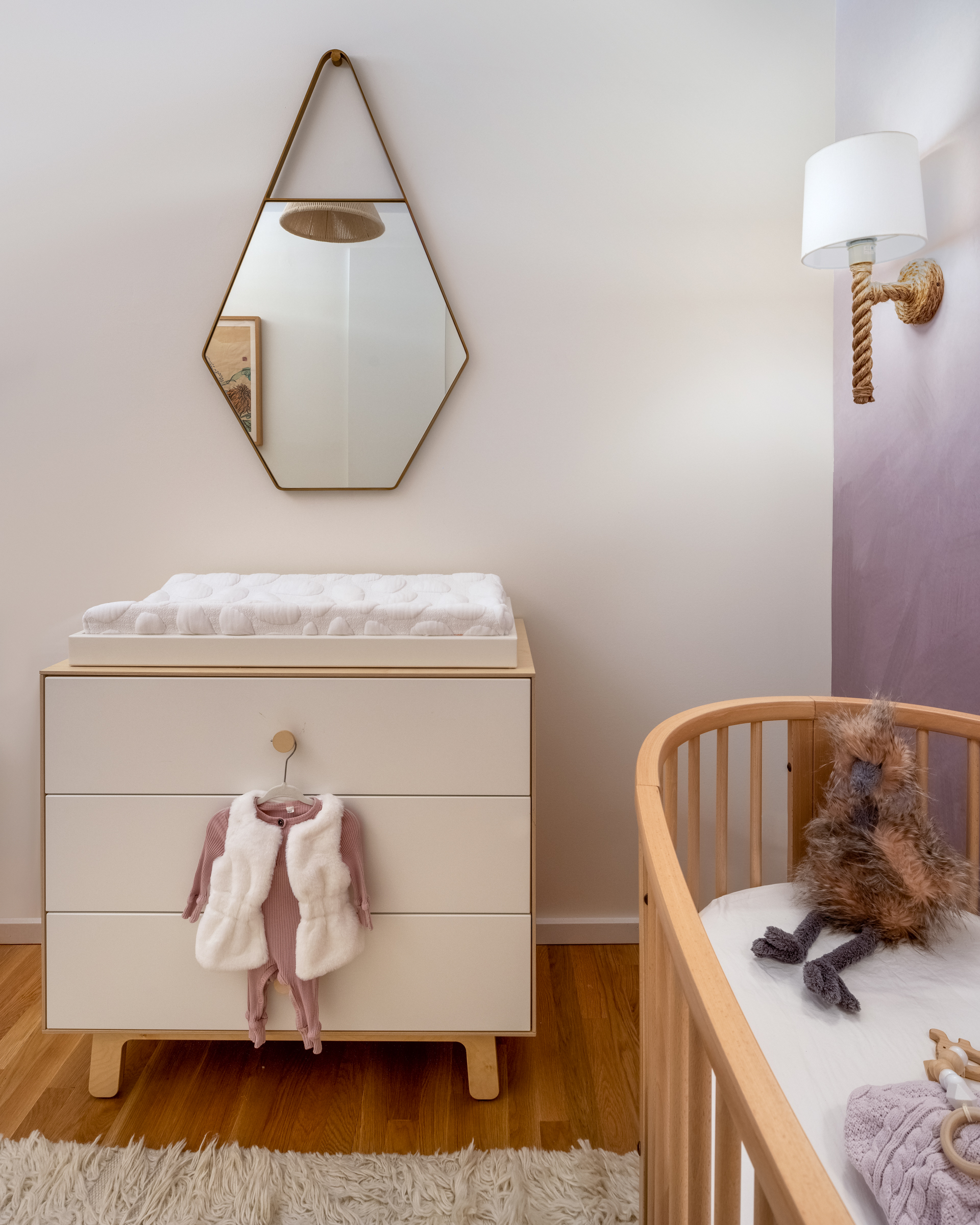 The crib is typically the primary piece in any nursery design, so selecting one that fits the space is crucial when determining the remainder of the layout. Kathy says the Stokke Sleepi crib is a great option for smaller spaces, as the circular shape allows more options for placement, and the wheels make it easy to adjust positioning—not to mention it can be expanded so it can grow right along with the child.
