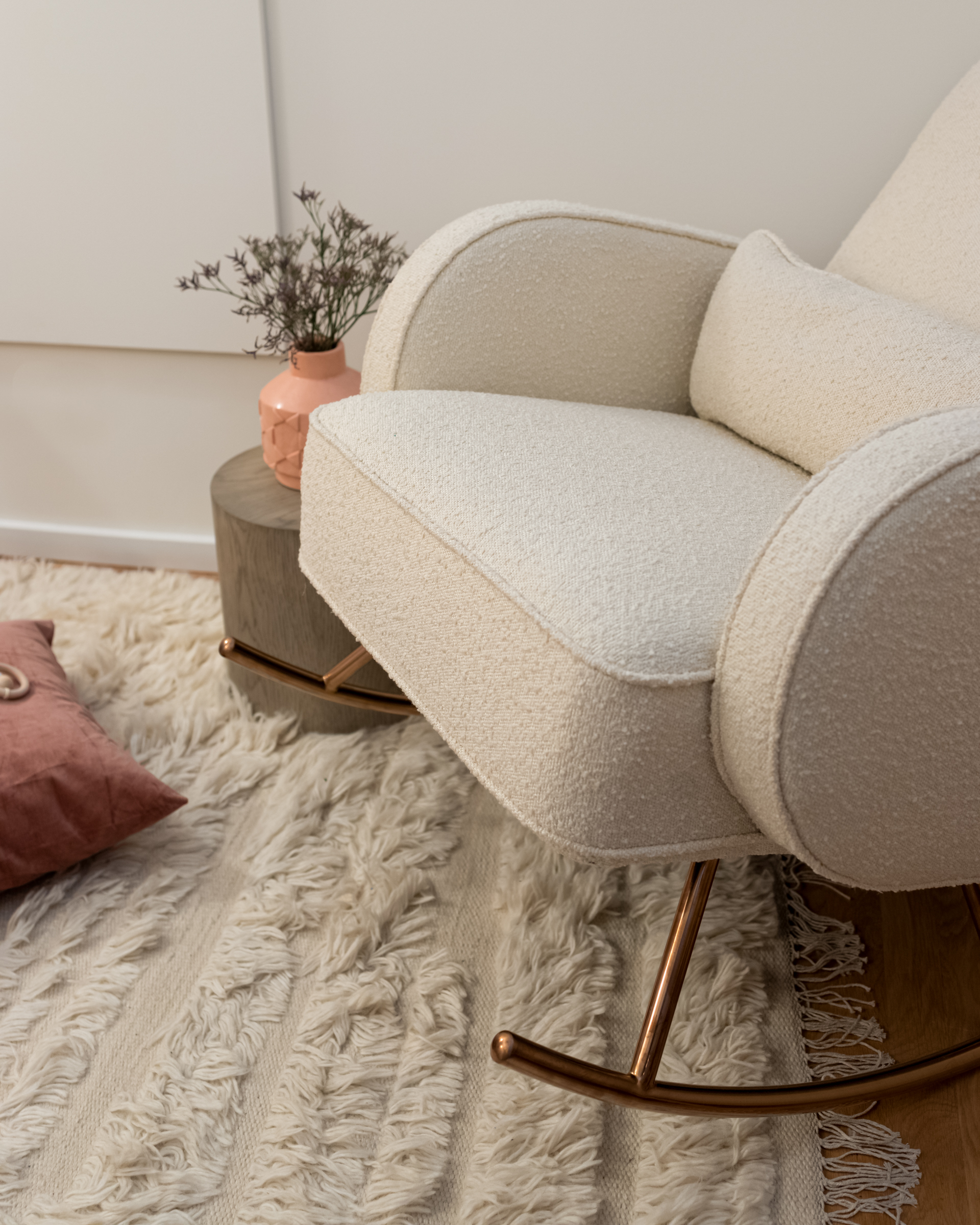 - Nursery Rocker in Classic Textured White Boucle with Rose Gold base by Connor Modern.