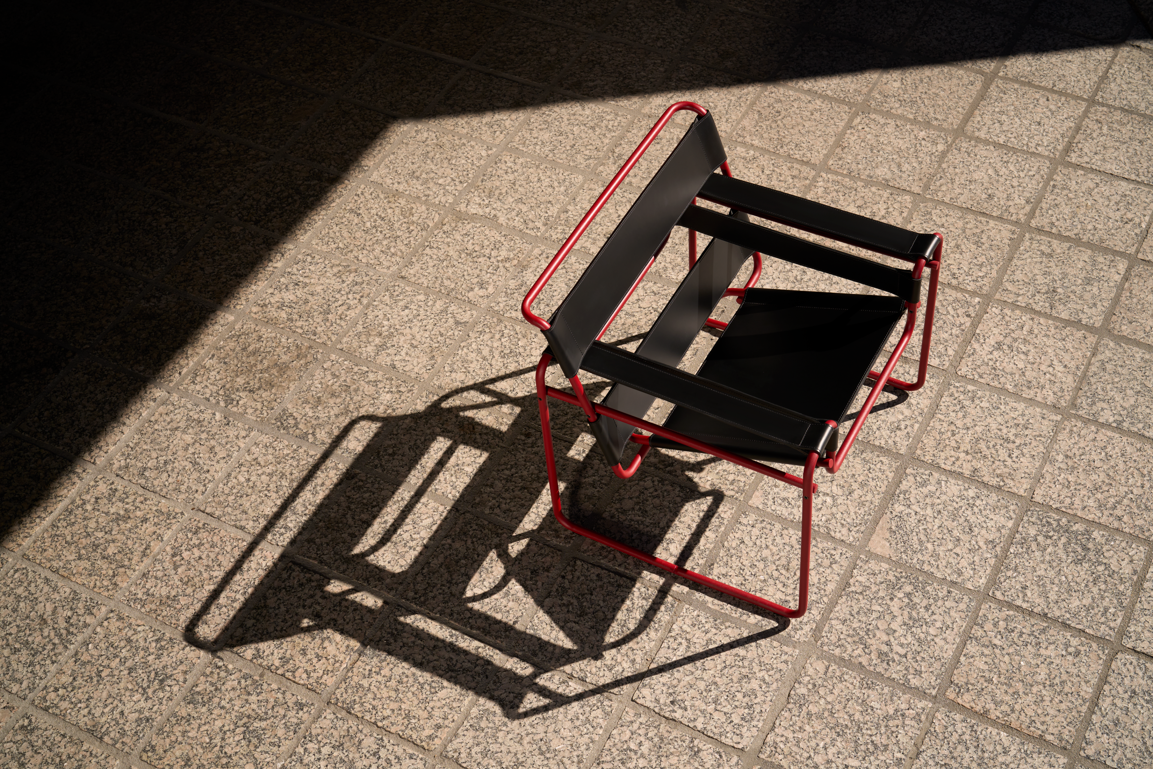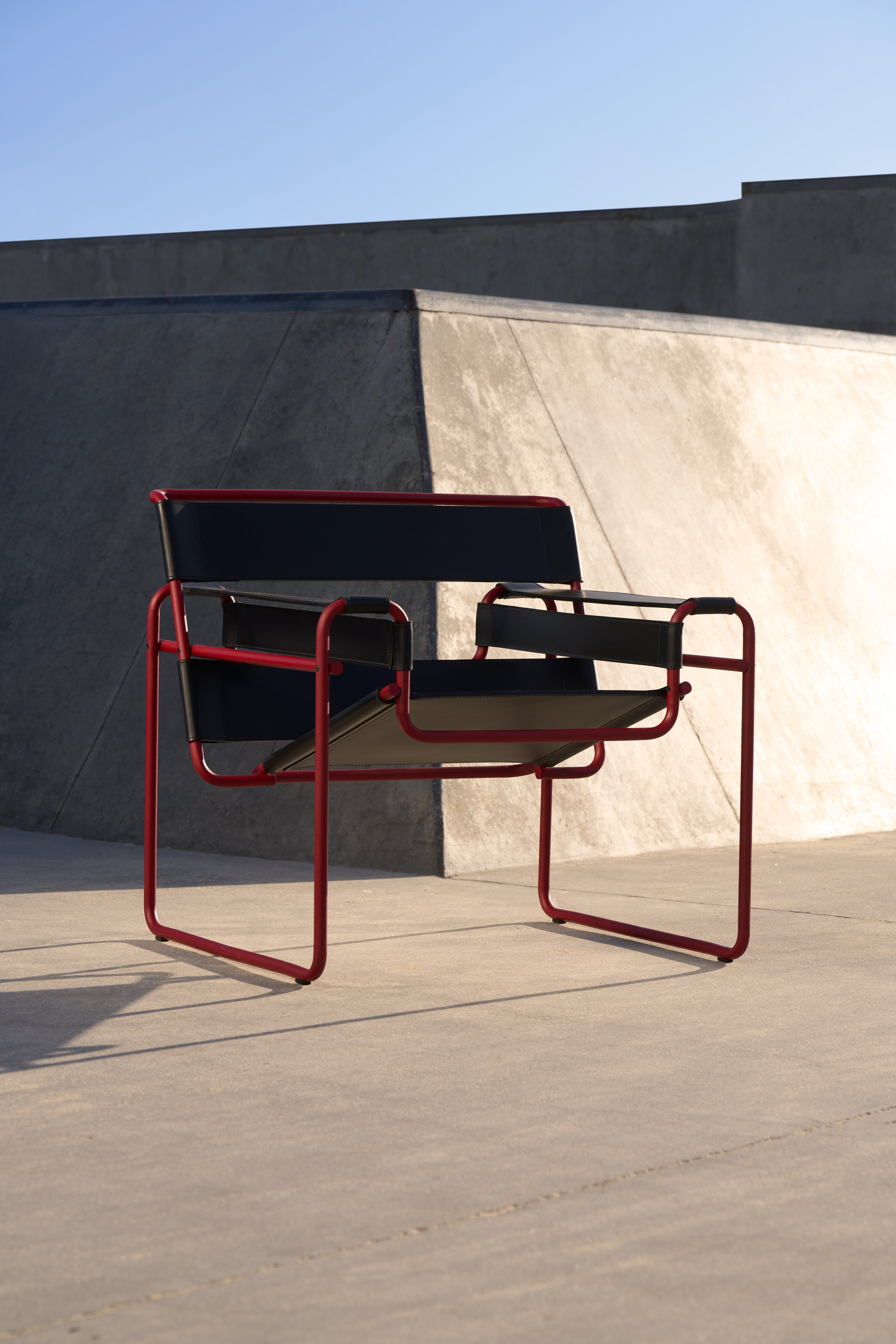 These designs are now being introduced in three new finishes: an archival dark red, white, and black. The iconic Wassily Chair by Marcel Breuer is constructed of leather or canvas straps stretched across a tubular steel frame.