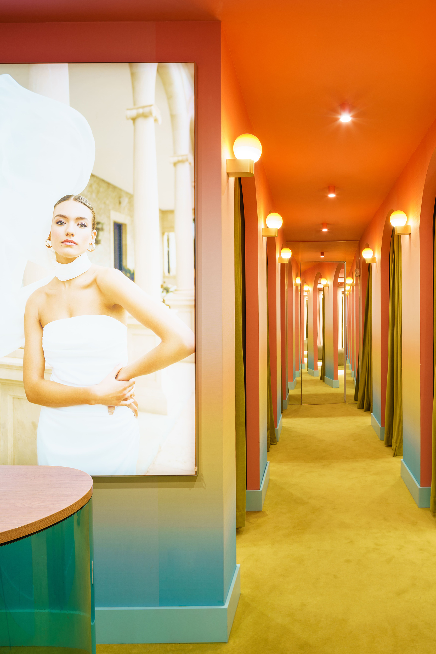 Colorful panels of methacrylate, similar to the orange storefront window, coat the store in green and orange reflections. They bounce the silhouettes of the colorful dresses and strappy sandals lining the racks, which are arranged by color so that wedding guests can beeline to their bride’s color scheme. The lucite also picks up the pink and yellow ripples swirling in a liquid-y, psychedelic carpet.