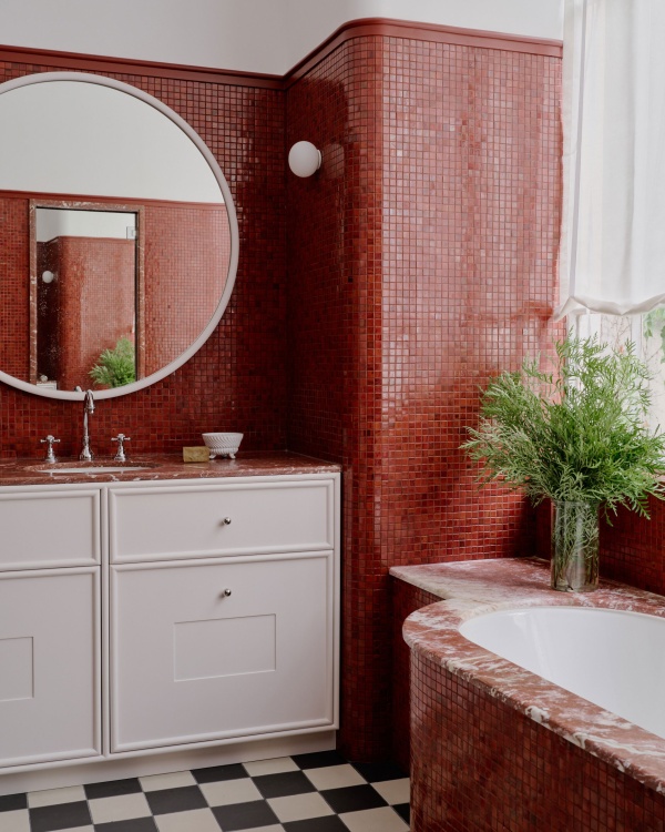 “We like to work subtly with contrasting colors and materials, creating worlds with character, but without being fashionable or boring. We began by looking for a warm, characterful marble, matching the rest with the checkerboard floor and paint colors. You don’t want to be overwhelmed by color but still have an interior with character.”