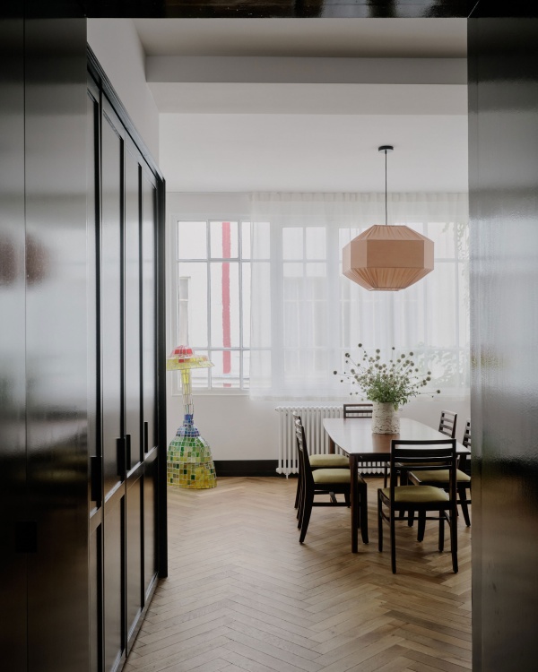 “The volumes, very different from classic Parisian Haussmann apartments, offered a unique opportunity to express ourselves in this type of setting. We focused on the right use of architectural elements without pretense. This luminaire was designed by artist Arthur Ristor, who works with glass in the style of stained glass.”