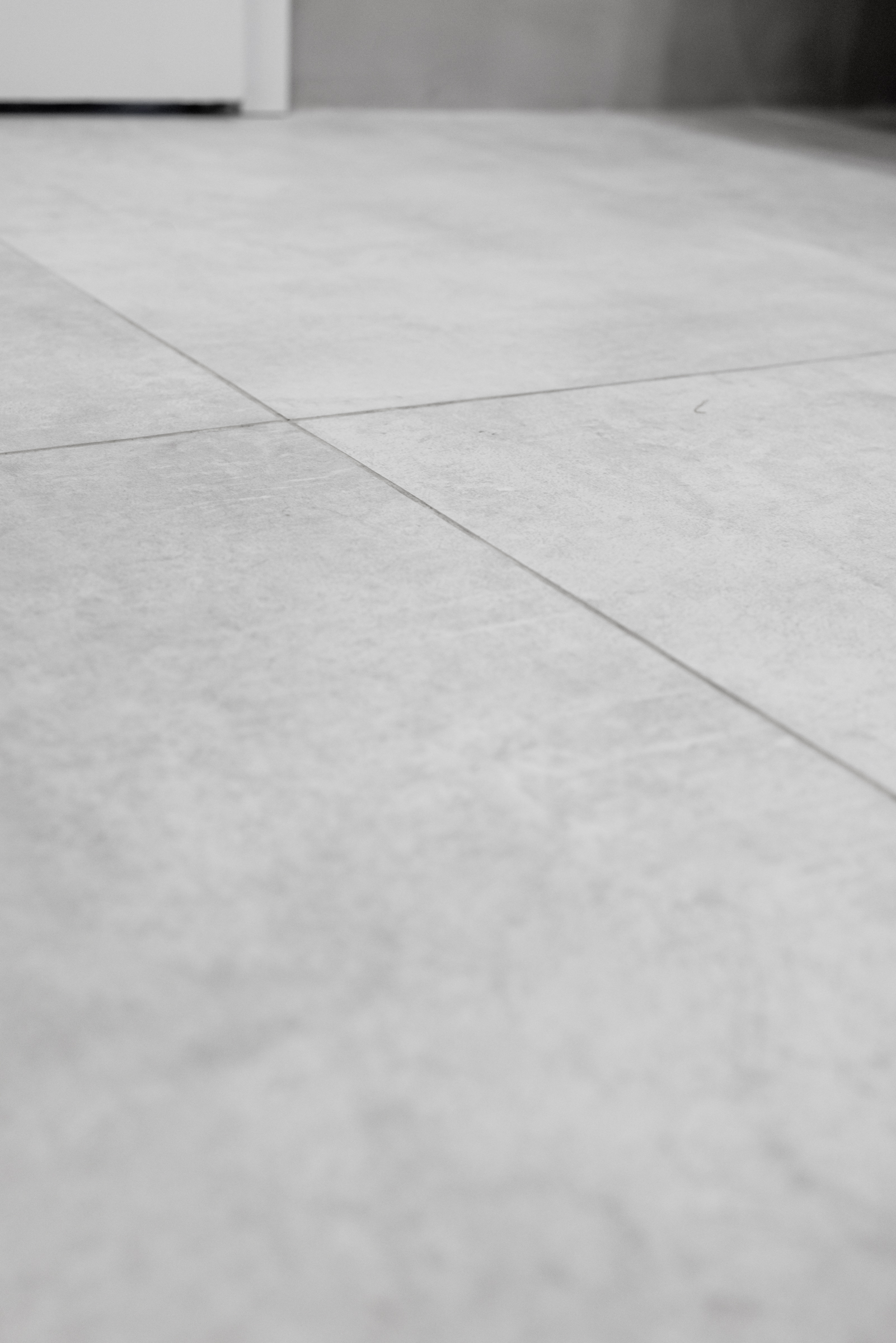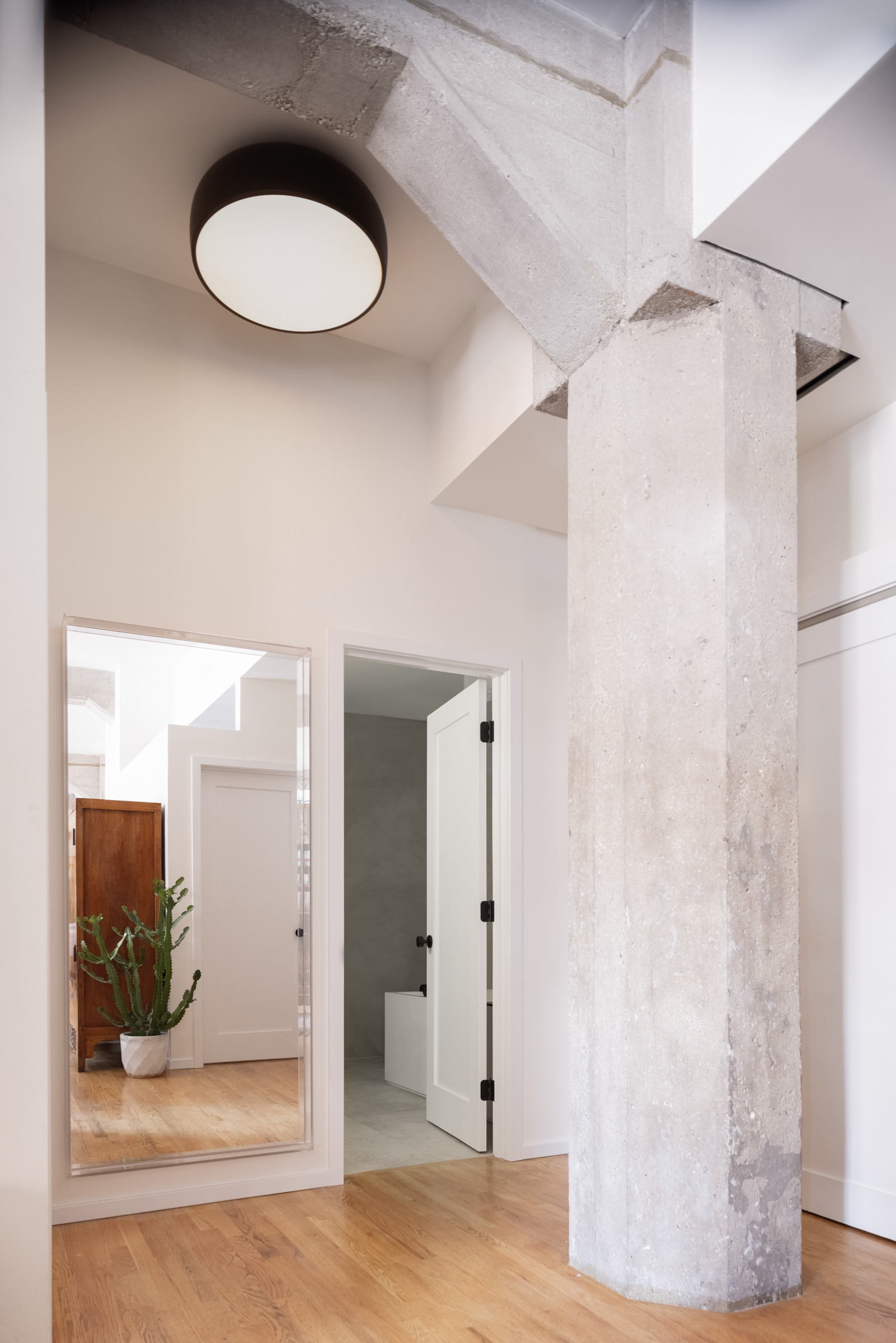 We choose to keep the pillar exposed to keep with a utilitarian look. We set out to find flooring that would work with the concrete but push it away from brutal and pull the design toward a welcoming and calming finish.