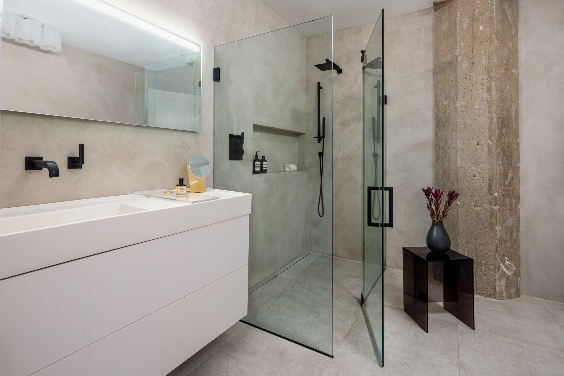 The building’s NYC loft vibes is one of the things that drew me to it, but the bathrooms were outdated and felt out of sync with the rest of the loft’s utilitarian and structural aesthetic.