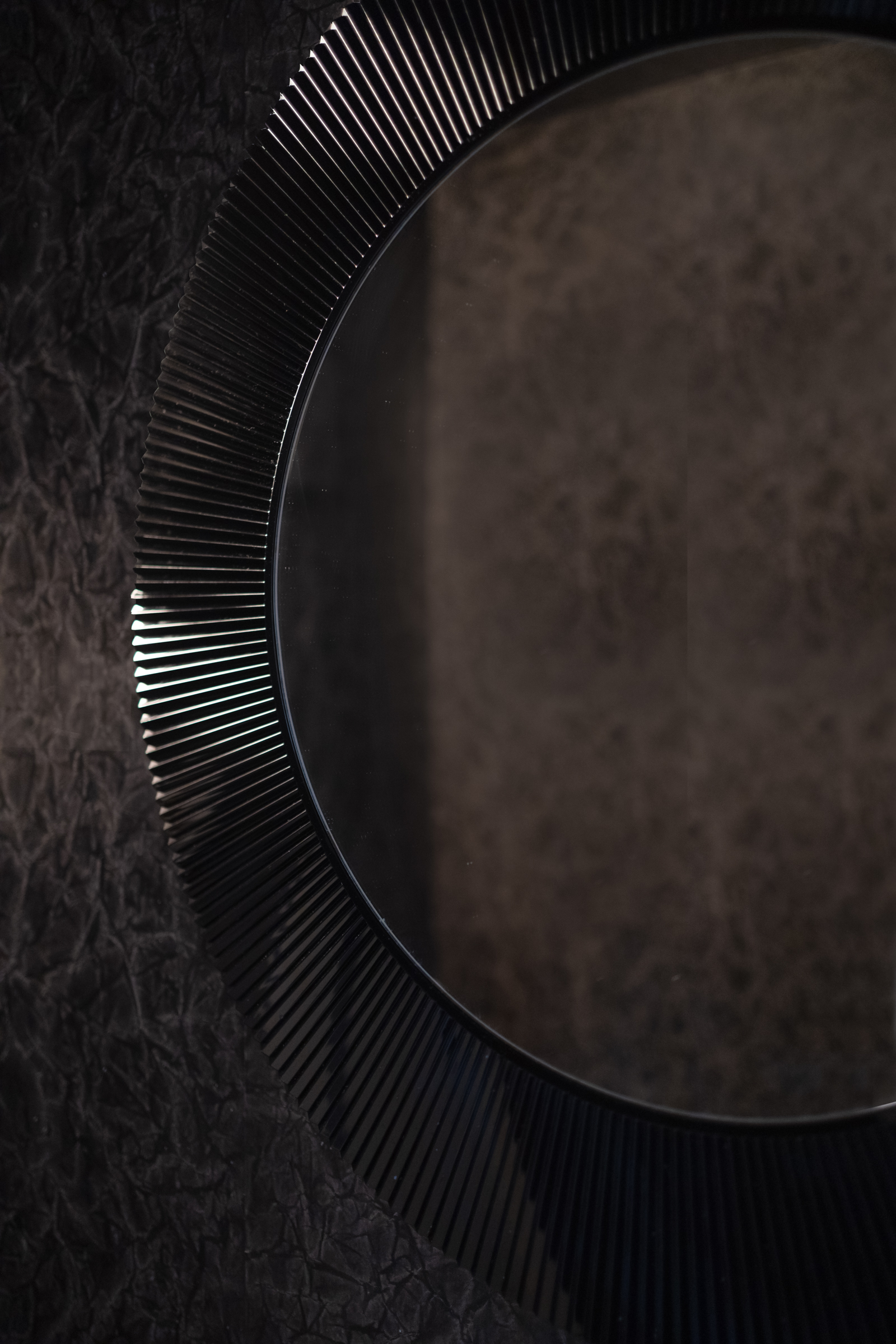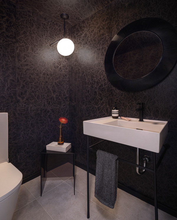 While we were renovating we decided to work on the loft’s half bathroom, too. Why not? We pulled the Cove Collection from Atlas Concorde USA into the room as well as a striking combo of a matte white washbasin from Kartell by Laufen with their black All Saints mirror. To punch up the theatrics of the room we finished the walls with the Mesa hand-painted wallpaper in slate from Maya Romanoff. It’s an amazing paper that brings the small room to life.