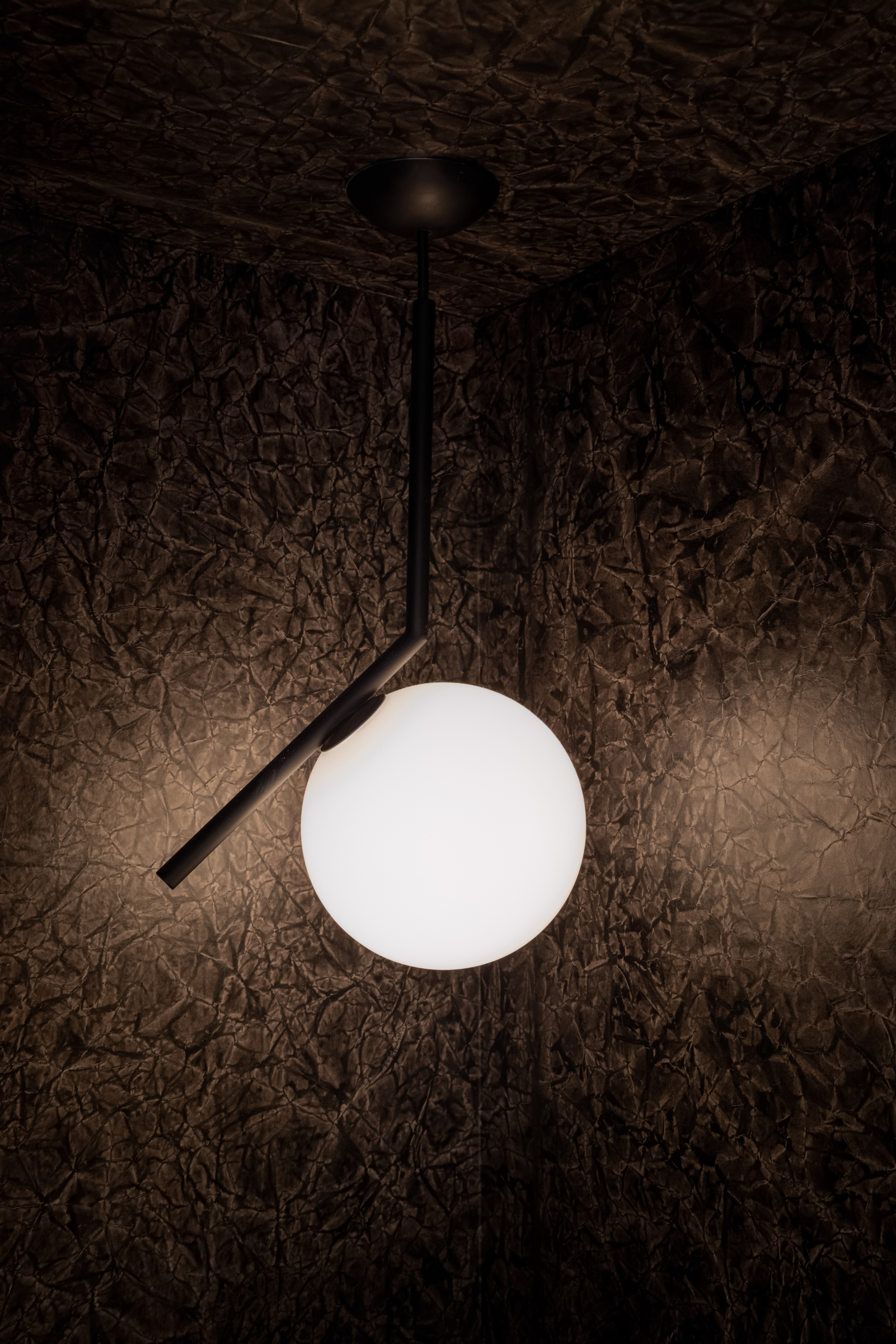 A hanging corner pendant light by FLOS creates a theatrical vibe in the room and plays off the subtle design of the deck-mounted monoblock Loft 2.0 mixer from Watermark Designs.
