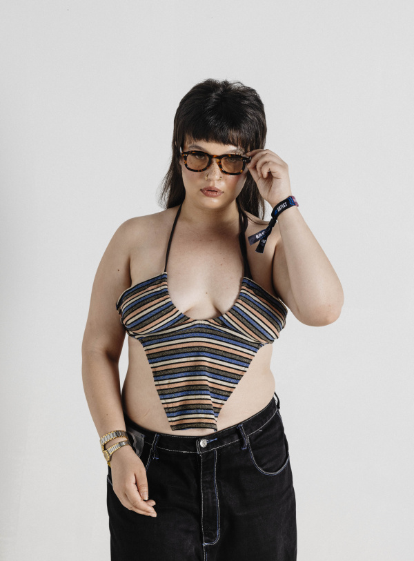 Ultimately when it comes to fashion, Lola simply wears what inspires her each day. She arrived at our studio in thick-rimmed glasses, a backless halter top, a calf-length jean skirt, and Air Jordans, adorned with two gold watches on her wrist. She brought knee-high platform combat boots, too—but she’s saving those for tonight’s set.