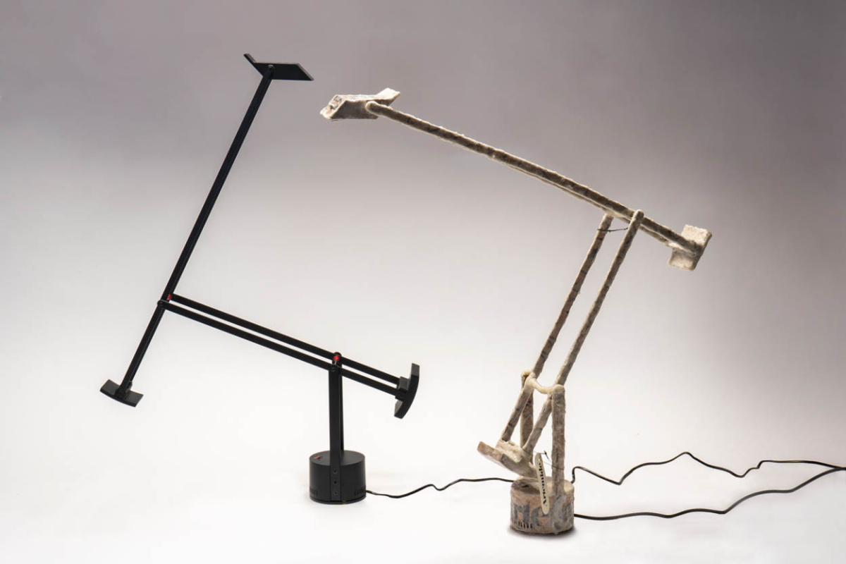I used 100% of the packaging material to make the lamp. I even sourced the energy transformer and the lightbulb from a secondhand lamp. It was like getting two lamps for the price of one, but it also serves as a “black mirror” that reflects on logistics, waste, and material consumption. I love that the Tizio replica is functional—it exists as both an object and a concept. I still have both the original and the replica in the studio.