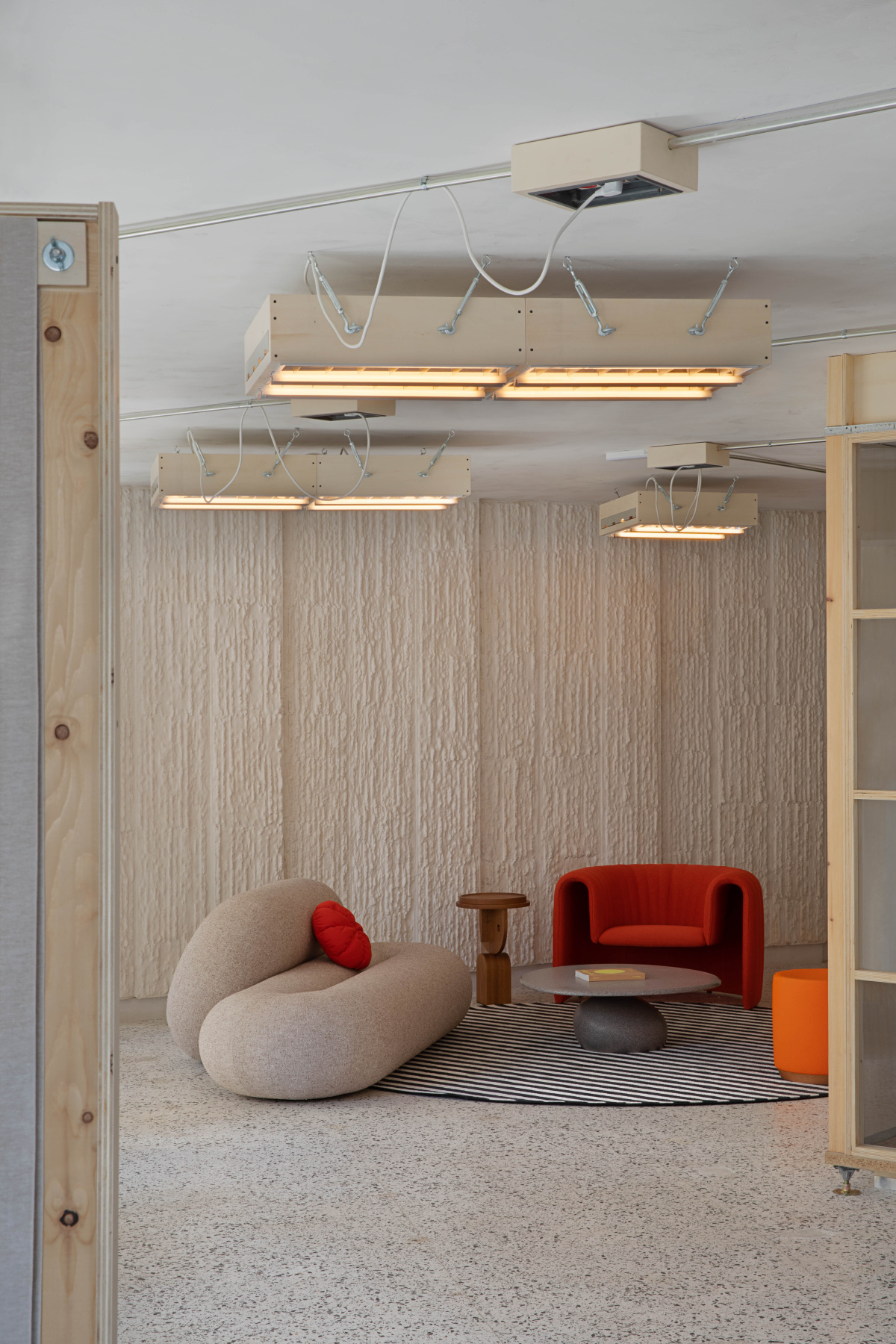 That’s why the lamps are suspended from the ceiling. We moved the sockets from the old technical floor to the ceiling, creating a grid of outlets. The lamps, which were recycled from the original space, can be repositioned anytime. We took the old fluorescent fixtures, rewired them with LEDs, and created a modular hanging system.