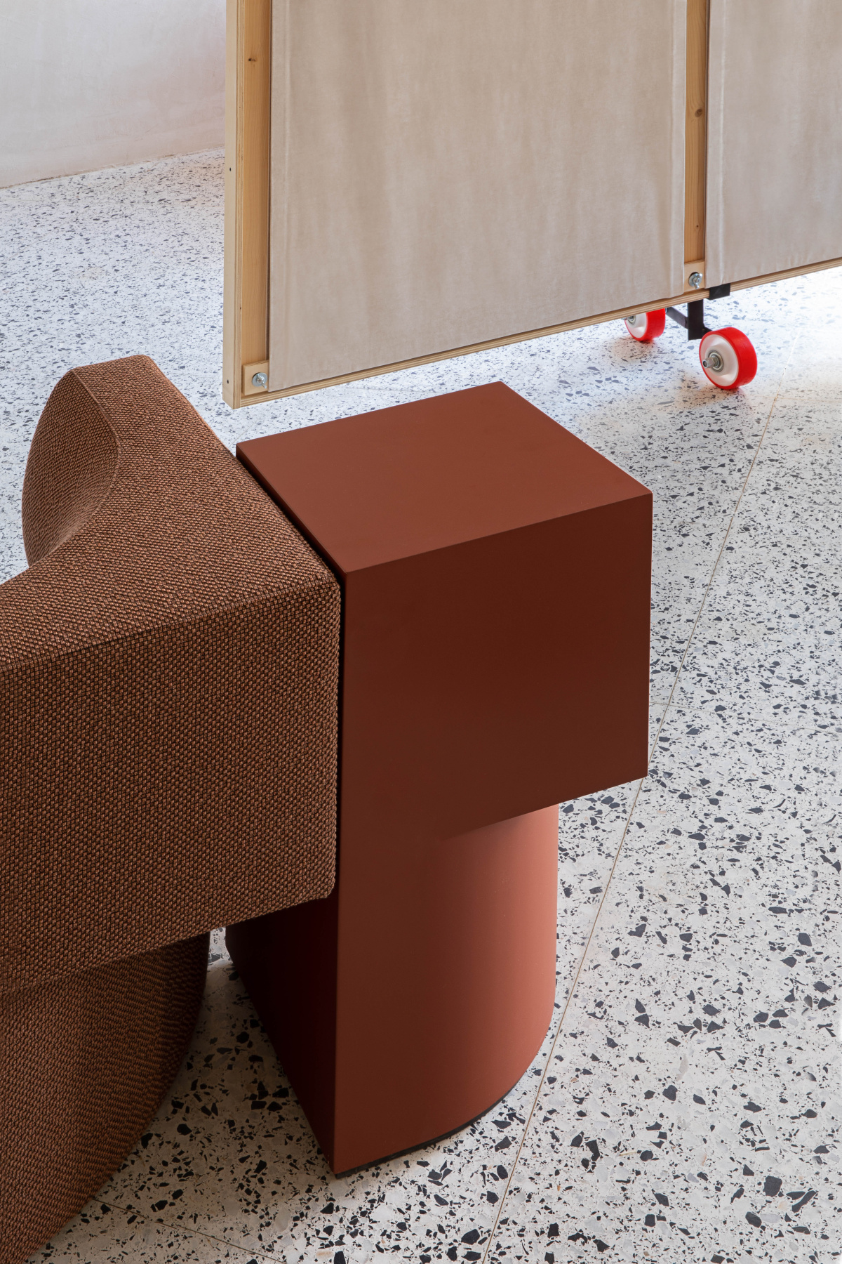 At the start of the COLAB project for Sancal, Lucas began thinking about the concept of a showroom. What does a showroom mean? How could he redefine it? “That’s when we came up with the idea of a showroom as a ‘walkable catalog,'” he says. “We created these massive panels on wheels that could display textiles instead of looking at a small swatch of fabric.”