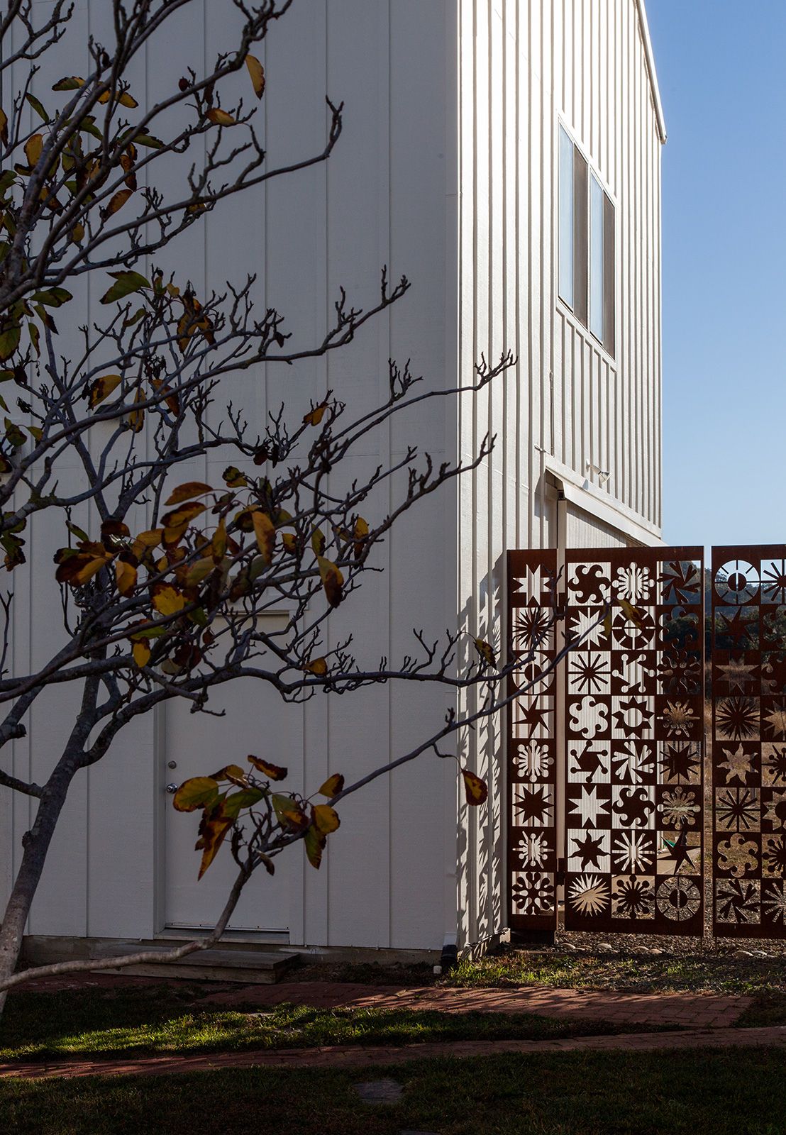 - “Sunburst Gate,” 1982, at edge of courtyard, Lucia’s Petaluma home. Design copyright Eames Office LLC dba Lucia Eames Archives. Phot: Richard Barnes © 2014 Richard Barnes, courtesy of Eames Office LLC