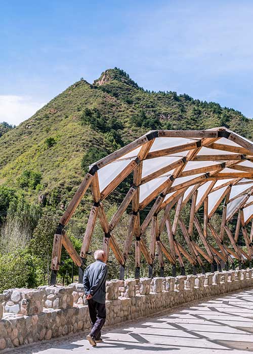 - The Luotuowan Village Pergola, made of reclaimed wood, sits at the foot of the Taihang Mountains.